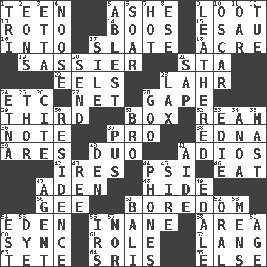 ACROSS 1. Adolescent 5. American tennis player Robert 9. Plunder 13. Printing process, for short 14. Expressions of contempt or scorn 15. He sold his birthright 16. To the inside or interior of 17. Schedule 18. 43,560 square feet 19. More lively and spirited 21. R.R. building 22. Snakelike fish 23. Cowardly lion portrayer 24. And so on (abbr.) 27. Fish or hair follower 28. Yawn 29. One of three equal parts 31. Gift holder 32. 480, 500 or 516 sheets of paper 36. Observe 37. Adept person 38. Pulitzer Prize-winning author Ferber 39. Ancient Greek god of war 40. Superhero pair 41. Goodbye (Sp.) 42. Angers 44. 23rd letter of the Greek alphabet 46. Ingest 47. An important port of Yemen 48. Flintstone garb 50. Unit of force equal to gravity 51. Mood resulting from idleness 54. Locale of original sin 56. Empty; void 58. Type of rug 60. Synchronize (abbr.) 61. Hero or heavy, e.g. 62. Long (Scottish) 63. False hair 64. Indian titles of respect 65. Otherwise DOWN 1. Three (prefix) 2. Immeasurably long periods of time 3. Singer James 4. Trap for birds or small mammals 5. Most capable 6. Fly high 7. Being at a high temperature 8. Compass dir. 9. Tough but pliablecoriaceous 10. Motion picture award 11. Boat paddle 12. Third day of the wk. 17. Filth; sediment 20. Post 21. Plant excrement 23. Not strict 24. Inactive volcano in Sicily 25. Son of Odin 26. Quote 28. Thick or sticky substance 30. Dwelling 31. Sis' sibling 33. Singer Brickell 34. Small Philippine buffalo 35. Vertical spar for supporting sails 37. Tenth month of the Hindu calendar 40. Lair 41. Assistant 43. To riddle 44. Gives a jingle 45. Male parent of an animal 47. Representative 49. Peak District village in England 51. Indonesian resort city 52. Of the mouth 53. Not women's 54. Eastern Standard Time (abbr.) 55. Color 56. Big collection agency 57. Not either 59. Mature