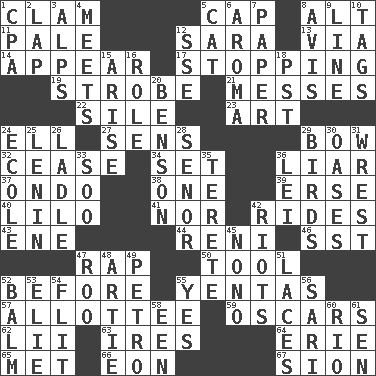 ACROSS 1. Burrowing marine mollusk 5. Head covering 8. Keyboard modifier key 11. Light colored 12. "Two Mules for Sister ____" 13. By way of 14. Seem 17. Ceasing 19. Disco prop 21. Makes clutter 22. Filth; sediment 23. Nonscientific branch of learning 24. Pipe bend 27. Elected reps. 29. Ribbon knot 32. Stop 34. Put into a specified state 36. One who doesn't tell the truth 37. Southwest Nigerian state 38. Single 39. Celtic language 40. _ and Stitch 41. Or not 42. Amusement-park features 43. Compass dir. 44. Painter Guido (1575-1642) 46. Fast jet (abbr.) 47. Hit sharply and swiftly 50. Implement 52. Prior to 55. Gossips 57. One to whom something is allotted 59. Motion picture awards 62. Cards in a Roman deck? 63. Angers 64. 4th largest of the Great Lakes 65. Was introduced to 66. Period of immesurable duration 67. The Jewish people; Israel DOWN 1. Tax preparer (abbr.) 2. Infant locale 3. High mountains 4. Confronts 5. Domesticated feline 6. Odor 7. Some stationery 8. Opinion 9. Actor's bit 10. Labels 12. Compass dir. 15. Ascend 16. Hero or heavy, e.g. 18. Pacific Standard Time (abbr.) 20. Gillaume's butler role 24. Learning spot: Fr. 25. Soviet premier 1918-24 26. Dipping utensil 28. Sir (Sp.) 29. Avian creatures 30. Fertile tracts in a desert 31. Take or capture by force 33. "Barney Miller" actor Jack 35. Cigar-shaped 36. Luau accessory 42. Disturbances 45. Words to Nanette 47. Friend of Pooh 48. Nick name for Arthur 49. Stone: prefix 51. Shoestrings 52. Lip ointment 53. Writer Wiesel 54. Secret move to avoid paying debts 55. Consenting reply 56. Indian skirt 58. Car or cant ending 60. River (Sp.) 61. Elected rep.