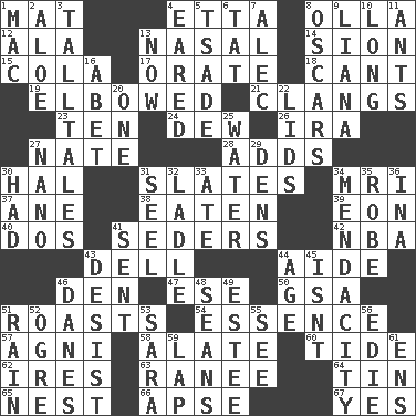ACROSS 1. Floor covering 4. Singer James 8. Rounded earthenware pot or jar 12. Insect wing 13. Rhinal 14. The Jewish people; Israel 15. Root beer relative 17. Declaim 18. Patter 19. Shoved, as through a crowd 21. Rings like a ship's bell 23. Nine, plus one 24. Morning condensation 26. Lyricist Gershwin 27. Nathan's nickname 28. Sums up 30. Actor Linden 31. Chalkboards 34. Medical imaging device (abbr.) 37. A saturated hydrocarbon 38. Eroded 39. Age 40. Two (Sp.) 41. Spring feasts 42. Basketball assoc. 43. Small valley 44. Helper 46. Lair 47. Compass dir. 50. Girls' org. (abbr.) 51. Exposes to great heat 54. Substance 57. Hindu god of fire 58. Having winglike extensions 60. Periodic rise and fall of the sea level 62. Angers 63. Indian princess (variant) 64. Shallow baking pan 65. Egg locale 66. Domed church section 67. Consenting reply DOWN 1. Big _ 2. Medicinal plant 3. Baron Munchausen's specialties 4. Having ears or earlike features 5. Sadhe (variant) 6. Make lace 7. Actor Baldwin 8. Motion picture awards 9. Woody, climbing, usually tropical plant 10. Yearn 11. Pismires 13. Immediately 16. Collude with 20. Single 22. Flaplike coverings 25. Wetness 27. Billionth: prefix 29. Habitations of wild animals 30. Possessed 31. Stitch closed the eyes of (a falcon) 32. Dipping utensil 33. Had dinner 34. Ananias' fault 35. Loose flowing garment 36. _ tizzy (2 wds.) 41. Posted 43. Cease 44. Personal question 45. Is not 46. Natives or inhabitants of Denmark 48. Actors Connery and Penn 49. First name in cosmetics 51. Water falling in drops from the sky 52. Legendary monster 53. "Two Mules for Sister ____" 55. Perceive with the eye 56. Singer Brickell 59. Infant locale 61. Followers of ems