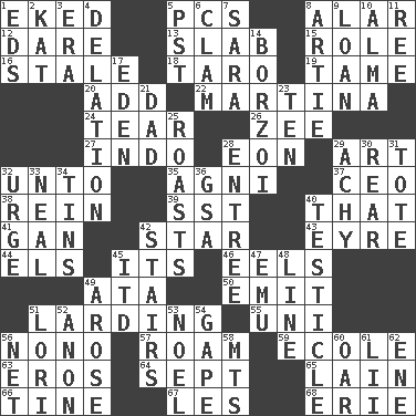 ACROSS 1. Made supply last 5. Personal Computers (abbr.) 8. Having or resembling wings 12. Have the gumption 13. Thick slice 15. Hero or heavy, e.g. 16. Having lost freshness 18. Pacific island yam 19. Not wild 20. Increase 22. Chrissie's court nemesis 24. Separate forcefully 26. Last letter of the English alphabet 27. _ china 28. Age 29. Tate display 32. To (old English) 35. Hindu god of fire 37. Corporate head (abbr.) 38. It's straight from the horse's mouth 39. Fast jet (abbr.) 40. Not this but _ 41. Separate the seeds from cotton 42. Play the lead 43. Jane of fiction 44. Raised railways 45. It is 46. Snakelike fish 49. "One Day ___ Time" 50. Give off 51. Preparing or cooking with lard 55. Single; one (prefix) 56. Words to Nanette 57. Wander aimlessly 59. Learning spot: Fr. 63. Greek god of love 64. Back-to-school mo. 65. (Had) reclined 66. Prong on a fork 67. French article 68. 4th largest of the Great Lakes DOWN 1. Begley and Asner 2. Krazy ___ of comics 3. Period 4. Accusation by an informer 5. Pacific Standard Time (abbr.) 6. Dollar (slang) 7. "Two Mules for Sister ____" 8. Nick name for Arthur 9. Grant temporary use of 10. _ mater 11. To sift 14. Tall fast-moving dog breed 17. Locale of original sin 21. June honoree 23. Nine, plus one 25. Cooks with dry heat, as in an oven 28. Main course 29. Painful 30. Hitchcock's "____ Window" 31. Haul 32. Goad 33. Anneal 34. Metal containers 36. Girls' org. (abbr.) 40. A testis 42. Flight of steps 45. It would 47. Australian flightless bird 48. Actor's bit 49. Came up 51. Australian parrot (variant) 52. At once, immediately (arch.) 53. Christmas carol 54. Stare wonderingly 56. Fish or hair follower 58. Mountains (abbr.) 60. Boat paddle 61. Cards in a Roman deck? 62. Compass dir.