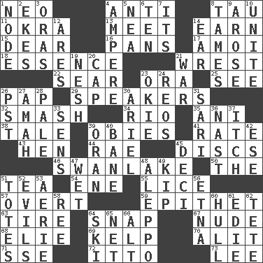 ACROSS 1. Modern: prefix 4. Against 8. The 19th letter of the Greek alphabet 11. Gumbo ingredient 13. Confront 14. Merit 15. Letter starter 16. Zero-star reviews 17. Mine, in Marseilles 18. Center 21. Take or capture by force 22. Shrivel 23. Mouth or opening 25. Perceive with the eye 26. Infant food 29. Orators 32. Box-office sellout 34. River (Sp.) 35. Cuckoo 38. Lie 39. Off-Broadway awards 41. Pace 43. Layer 44. Actress Charlotte 45. Flat circles 46. Tchaikovsky ballet 50. Definite Article 51. Beverage made from leaves 54. Compass dir. 55. Louse (plural) 57. Unconcealed 59. Curse 63. Hoop that covers a wheel 64. Fastener 67. Unadorned 68. Writer Wiesel 69. Seaweed 70. Came down and settled, as after flight 71. Compass dir. 72. "Tell ____ the Marines!" 73. Area sheltered from the wind DOWN 1. Thickened enlargement 2. Supplements with great effort 3. Mouths or openings 4. Electrical Unit 5. Teachers' org. 6. "___ Little Indians" 7. It is 8. Corrects by punishment or discipline 9. Came up 10. Join together 12. Ancient Greek god of war 14. Ewer handle 19. Soft 20. Head covering 21. Armed conflict 23. Migrant worker of the '30s 24. Vintage cars 26. Pacific Standard Time (abbr.) 27. Nursemaid 28. Diluted with white 30. Satellite of Uranus 31. Indian skirt 33. Elected reps. 36. Political cartoonist Thomas 37. Hankering 39. NW Algerian seaport 40. Object of repulsion 42. Compass dir. 45. Tenth: prefix 47. Dripping 48. City in Syria 49. Sleep 51. Lugs 52. Vices 53. Nest on high 56. Inactive volcano in Sicily 58. To riddle 60. Frame or body of a ship 61. Singer Brickell 62. Wig 64. What Jean-Claude Killy likes to do 65. Fish or hair follower 66. The first octave above the treble staff