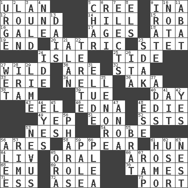 ACROSS 1. ____ Bator, Mongolia 5. Algonquian 9. _ tizzy (2 wds.) 12. Having a circular shape 14. Land elevation 15. Director Reiner 16. An organ shaped like a helmet 17. Grows older 18. _ moment's notice (2 wds.) 19. Conclusion 20. Of or pertaining to medicine 23. Proofreading order 24. Small island 25. Periodic rise and fall of the sea level 27. Uncontrolled 30. "We ___ not amused" (Victoria) 32. R.R. building 33. 4th largest of the Great Lakes 34. 1994 drama film starring Jodie Foster 36. Alias (abbr.) 38. Scottish cap 39. Third day of the wk. 40. 24 hours 43. Snakelike fish 46. Pulitzer Prize-winning author Ferber 48. Singer Brickell 49. Slangy assent 51. Period of immesurable duration 52. Fast planes 53. Tender 54. Loose flowing garment 56. Ancient Greek god of war 58. Seem 61. Attila the _ 64. 54 in ancient Rome 65. Spoken 66. Came up 68. Australian flightless bird 69. Hero or heavy, e.g. 70. Domesticates 71. Curvy letter 72. At sea 73. Sweet dark-red dessert wine DOWN 1. Goad 2. Grant temporary use of 3. Old (Scot.) 4. Compass dir. 5. Burn to charcoal 6. Swiss mountan, "Queen of the Mountains" 7. Opts 8. Raised railways 9. Feeling or showing extreme anger 10. Make mention of 11. Blind as ____ 13. Raised platform 21. Actor Alda or Thicke 22. Cigar-shaped 23. Neighbor of Neb. 24. Binary compound 26. Call ___ day 27. Soggy 28. Lyricist Gershwin 29. Welles in "The Third Man" 31. Dodge 35. Poe poem 37. Sums up 41. Small island 42. Consenting reply 44. Snake ____ (dice throw) 45. French article 47. Small Philippine buffalo 48. Compass dir. 50. N Egypt peninsula 53. Congenital growth or mark on the skin 55. Naughty child 56. Toward shelter 57. Basketball hoops 59. Diluted with white 60. Entreaty 61. Like (prefix) 62. One who uses or employs something 63. Egg locale 65. Mouth or opening 67. Hit sharply and swiftly