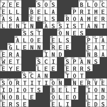 ACROSS 1. Last letter of the English alphabet 4. Distress signal 7. Coalition 11. Pipe bend 12. Actor Lugosi 13. First class 14. White ___ sheet 15. Snakelike fish 16. Wanderer 17. Soviet premier 1918-24 19. Helper 21. Fast jet (abbr.) 23. Singles 24. _ vera 25. Raised railways 26. Parent Teacher Assoc. 29. American astronaut and politician John 30. Portuguese money of account (variant) 31. Ingest 32. Period 33. Indiana (abbr.) 34. Basketball assoc. 35. Soggy 36. _-fi 37. Connects, as a bridge 40. Sight organ 41. Area sheltered from the wind 42. Blunders 43. Examine hastily 45. Small child 46. Conclusion 51. Impudent aggressiveness 55. Foolish or stupid persons 56. Waist strap 58. Electrically charged atom 59. Impressive in appearance 60. Butter sub 61. Hat (slang) 62. Celtic language 63. Biblical high priest 64. Begley and Asner DOWN 1. Ardor 2. Otherwise 3. Flair 4. Observe 5. Water jar 6. Backtalk 7. Naughty children 8. Pale green bean 9. Sign of something about to happen 10. Sure thing 12. Gillaume's butler role 13. Airs 16. Remove soap 18. Small island 20. Having a sole or soles 22. "___ Little Indians" 24. Having winglike extensions 25. Bert's buddy 26. Actor Sean's family 27. Bar bills 28. "One Day ___ Time" 29. Jennifer or Joel 32. She-sheep 33. Ancient Celtic tribe of eastern Britain 36. Narrow boards 37. Put into a specified state 38. Right away 39. Johnson of "Laugh-In" 43. Took without asking 44. Quote 46. Trig term 47. Aroma 48. Teases 49. Mitch Miller's instrument 50. 1994 drama film starring Jodie Foster 52. Cause heat under the collar 53. Nothingness 54. Conclusions 57. Luau accessory