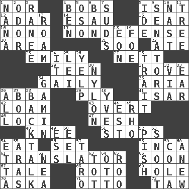 ACROSS 1. Or not 4. Moves up and down 8. Is not 12. The sixth month of the Jewish calendar 14. He sold his birthright 15. Letter starter 16. Words to Nanette 17. Unrelated to defense, as in spending 20. Length times width 21. "Barney Miller" actor Jack 22. Had dinner 23. Poet Dickinson 27. Remaining after all deductions 29. Adolescent 31. Be footloose 34. Lightheartedly 35. Operatic vocal solo 36. Swedish rock group 39. Strand of rope, yarn or thread 41. Austrian river, tributary to the Danube 42. Rich soil 43. Unconcealed 46. Locales 47. Tender 48. Leg joint 51. Closes up, plugs up 54. Ingest 56. Arrange properly for use 58. South American Indian 61. Interpreter 66. Within a short period 67. Falsehood 68. Printing process, for short 69. Hollow 70. "____ silly question..." 71. Von Bismarck 72. The 23rd letter of the Hebrew alphabet DOWN 1. Grandmother 2. Aroma 3. The wife of a rajah (variant) 4. Benjamin's nick name 5. Bear (Spanish) 6. Forbid 7. Beer foam 8. Binary compound 9. Legislators 10. Political cartoonist Thomas 11. Relationship diagram 13. Wander aimlessly 18. A really long time 19. Enemy 24. Call ___ day 25. Luau accessory 26. Sharp bark 28. Distinguishing feature 30. High-strength synthetic material 32. By way of 33. Ewer handle 34. Street urchin 36. 100% 37. Sometimes accompanies a hiss 38. Sass 40. Jacques Cousteau's middle name 44. Eastern Standard Time (abbr.) 45. 17th letter of the Greek alphabet 49. Curvy letter 50. Snakelike fish 52. Expression of disdain 53. Snout, nose 54. Singer James 55. Ancient river in northeast Turkey 57. Pacific island yam 59. Root beer relative 60. Afresh 62. Teachers' org. 63. Small child 64. Baseball player Mel 65. Friend of Pooh