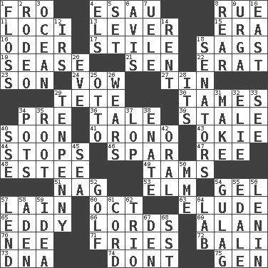 ACROSS 1. Back 4. He sold his birthright 8. Regret 11. Event scenes 13. Crowbar 15. Epoch 16. Baltic tributary 17. Vertical member of a panel or frame 18. Settles 19. Gospel singer Marvin 21. Elected rep. 22. Part of Q.E.F. 23. Manchild 24. Solemn pledge 27. Shallow baking pan 29. Wig 30. Softens 34. Before (prefix) 36. Falsehood 39. Showing deterioration from age 40. Within a short period 41. U. of Maine site 43. Migrant worker of the '30s 44. Constricts 46. Coast Guard woman 47. To separate or throw off 48. First name in cosmetics 49. Scottish caps 51. Tired old horse 53. Shade tree 54. Set 57. (Had) reclined 60. Sep. follower 63. Dodge 65. Whirlpool 66. Domineers 69. ____ Jay Lerner 70. Born 71. Strips of potato fried in deep fat 72. Indonesian resort city 73. Heredity factor (abbr.) 74. Do not 75. Commissioned mil. rank DOWN 1. Soft thread for cleaning between teeth 2. Cowboy competition 3. Sea 4. Raised railways 5. Arrange properly for use 6. Advice 7. Ubangi River tributary 8. Tail end 9. Capital and largest city of Mongolia 10. Compass direction 12. Big collection agency 14. Monthly bill 18. Elected representatives 20. Night before a holiday 25. "Beetle Bailey" pooch 26. Puts on (as clothing) 28. It is 29. 3-inch nail 31. Cause to be 32. Writer Wiesel 33. Perceive with the eye 34. Cooking vessels 35. Carrot, for example 37. Chop off 38. Maternal 40. Compass dir. 42. Of the mouth 45. Ocean 50. Madame (abbr.) 52. Eighteen holes 54. Russian prison camp 55. Peak District village in England 56. Soviet premier 1918-24 57. Grant temporary use of 58. An important port of Yemen 59. It may be bright or harebrained 61. Drawstring 62. Musical group of three 64. Experiment locale 67. Lair 68. Fast jet (abbr.)