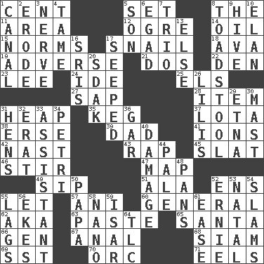 ACROSS 1. Penny 5. Put into a specified state 8. Definite Article 11. Length times width 12. Legendary monster 14. Lubricate 15. Typical models 17. Slow-paced one 18. Actress Gardner 19. Contrary to your interests or welfare 21. Two (Sp.) 22. Lair 23. Area sheltered from the wind 24. Binary compound 25. Raised railways 27. Plant excrement 28. A whole individual unit 31. Pile 35. Cask 37. Globular water bottle used in Asia 38. Celtic language 39. Male parent 41. Charged atoms 42. Political cartoonist Thomas 43. Reproach for some lapse or misdeed 45. Narrow board 46. Disorderly outburst 47. Atlas unit 49. Small drink 51. In the manner of 52. Followers of ems 55. Allow 57. Black tropical American cuckoo 60. Commissioned military rank 62. Alias (abbr.) 63. Thick mixture 65. Before Barbara or Clara 66. Commissioned mil. rank 67. Of or related to the anus 68. Thailand, formerly 69. Fast jet (abbr.) 70. The grampus (Milton) 71. Snakelike fish DOWN 1. Lessep's creation 2. Eat (away) 3. Boldness 4. Docile 5. Male child 6. Mild oath 7. Musical group of three 8. Inedible or poisonous agaric 9. Hub of activity 10. Flair 13. Otherwise 16. Indian titles of respect 17. Oozed 20. Neighbor of Neb. 26. Ms. Damita and namesakes 29. Inactive volcano in Sicily 30. Vertical spar for supporting sails 31. Coop moms 32. Part of Q.E.F. 33. Helper 34. _ dish (used to culture cells) 36. Slender fish 40. Break 44. Diluted with white 48. Baking dishes 50. Dad 52. Bert's buddy 53. Brizilian seaport 54. Shuts with force 55. Fails to keep up a pace 56. Makes supply last 58. Billionth: prefix 59. Austrian river, tributary to the Danube 61. Relaxation 64. Affectionate concern, for short