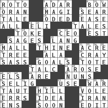 ACROSS 1. Printing process, for short 5. The sixth month of the Jewish calendar 9. Ribbon knot 12. NW Algerian seaport 13. Wise men 14. Dry up 15. Story 16. Wrote a lyric poem 17. Relaxation 18. 100% 19. Biblical high priest 21. Stories 22. Puff or smoke 24. Corporate head (abbr.) 26. Eastern Standard Time (abbr.) 27. Gurus 28. Long (Scottish) 29. Shopping center 30. One or ones belonging to thee 32. 1/640 square mile 36. Woody plant 37. Chicken ___ king 38. Supercomputer manufacturer 39. Backtalk 40. Finish lines 42. Carryall 43. Baby powder 44. Came up 46. Raised railways 49. "We ___ not amused" (Victoria) 50. Religious women 51. Former Milwaukee Brewers owner Bud 53. Purpose 54. Armed conflict 57. Drawn tight 58. Land elevation 61. Grand slam 62. Blunders 63. The content of cognition 64. SW Asia republic 65. Followers of ems 66. Within a short period 67. Prepare for publication DOWN 1. Roll call or roster of names 2. Taken by mouth 3. Baron Munchausen's specialties 4. Single 5. Mine, in Marseilles 6. June honoree 7. Mature 8. To free from 9. Calif. Air Force Base 10. Fertile tracts in a desert 11. Take or capture by force 14. Ocean 19. Supplement with great effort 20. For fear that 21. Coat; cloak 23. Stares at amorously 24. Lessep's creation 25. Compass dir. 27. "Two Mules for Sister ____" 28. Pale purple color 29. Mountains (abbr.) 31. White Person, in Hawaii 32. 13-14th century defensive garment 33. What you're doing now 34. Pace 35. Sight organ 40. Slender fish 41. Without 43. Label 45. Regret 46. First name in cosmetics 47. Acquire or gain knowledge or skills 48. Runs notes together 52. ___ a Wonderful Life 53. ____ Bator, Mongolia 55. Jai _ 56. Monthly bill 58. Part of HMS, perhaps 59. Wedding promise 60. Lion 61. Compete