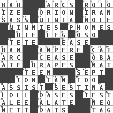 ACROSS 1. Long, evenly shaped piece 4. Curves 8. Printing process, for short 12. Ending with capital 13. Greek mythologigal hunter 14. SW Asia republic 15. Backtalk 17. National forest in Provo, Utah 18. Undercover agent 19. Fools 21. Gives a jingle 23. Expire 24. Part of a journey 26. Bear (Spanish) 27. False hair 28. Comfort 30. Bar 31. Electrical Unit 34. Domesticated feline 37. Curve 38. Desist 39. Chief or king in Benin or Nigeria 40. Had dinner 41. Window treatments 42. Floor protector 43. Adolescent 44. Back-to-school mo. 46. Electrically charged atom 47. Scottish cap 50. Wedding promise 51. Aid 54. French poetic form 57. Hang loosely or laxly 58. Fertile tracts in a desert 60. Trial 62. Toward shelter 63. Having winglike extensions 64. Modern: prefix 65. Remaining after all deductions 66. Raised platform 67. Label DOWN 1. Altar cloth linen 2. Muslim summons to prayer 3. Home 4. Satellite of Uranus 5. Remove soap 6. Small bed 7. Fastener 8. Full of chinks, cracks, or crevices 9. U. of Maine site 10. Lie 11. Singles 13. Fr. "Yes" 16. In a ____ (agitated or irritated) 20. Born 22. Flexible conduit 25. Honkers 27. Small pie 29. Ancient Greek god of war 30. Sound made by sheep 31. 1/640 square mile 32. Intended 33. Infant food 34. Part 35. Blind as ____ 36. Make lace 41. Lairs 43. Bathroom 44. Be seated 45. Prepare for publication 46. Small island 48. Slender Brazilian palm 49. Confronts 51. ____ Jay Lerner 52. Flatfish 53. Frog relative 55. Compass dir. 56. Toward the sea 59. Wing 61. Coat; cloak