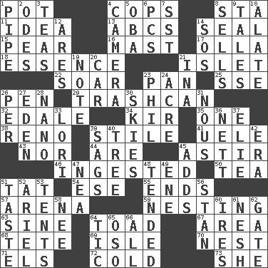 ACROSS 1. Plant holder 4. 911 reaches them 8. R.R. building 11. The content of cognition 13. Lettered men learn these first 14. Lick closed 15. Lightbulb-shaped fruit 16. Vertical spar for supporting sails 17. Rounded earthenware pot or jar 18. Center 21. Small island 22. Fly high 23. Baking dish 25. Compass dir. 26. Animal enclosure 29. File 13 32. Peak District village in England 34. Apertif with cassis 35. Single 38. Western Nevada city 39. Vertical member of a panel or frame 41. Ubangi River tributary 43. Or not 44. "We ___ not amused" (Victoria) 45. Moving or stirring 46. Eaten 50. Afternoon social gathering 51. Make lace 54. Compass dir. 55. Conclusions 57. Sports stadium 59. Inhabiting a nest 63. Trig term 64. Frog relative 67. Type of rug 68. Wig 69. Small island 70. Egg locale 71. Raised railways 72. Chilled 73. A female animal or person DOWN 1. Corncob 2. Lyric poems 3. Beverages made from leaves 4. Device for capturing images 5. Chief or king in Benin or Nigeria 6. Personal Computers (abbr.) 7. Fast jet (abbr.) 8. Makes a sale 9. Stories 10. Having winglike extensions 12. Ancient Greek god of war 14. Mayday 19. Musical sound 20. Automobile 21. _ tizzy (2 wds.) 23. Silvers or Donahue 24. Land measure 26. For each 27. Locale of original sin 28. Billionth: prefix 30. Atmospheres 31. Common sense 33. Australian parrot (variant) 36. Remaining after all deductions 37. Writer Wiesel 39. Sinks 40. Relationship diagram 42. Period 45. Does sums 47. Teachers' org. 48. Watched over 49. Compass dir. 51. Clothes sense 52. Satellite of Uranus 53. Portable shelters 56. Comedian Laurel of Laurel & Hardy 58. Born 60. Angers 61. Tender 62. Yard entry 64. Nervous spasm 65. Bear (Spanish) 66. Everything