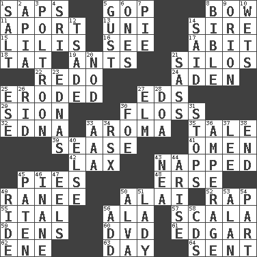 ACROSS 1. Plant excrements 5. Republican Party 8. Ribbon knot 11. To the left, to Queeg 13. Corn or form start 14. The founder of a family 15. Ms. Damita and namesakes 16. Perceive with the eye 17. "This won't hurt ____!" 18. Make lace 19. Pismires 21. Grain storage towers 22. Make new 24. Arabian gulf 25. Worn away 27. Begley and Asner 29. The Jewish people; Israel 30. Soft thread for cleaning between teeth 32. Pulitzer Prize-winning author Ferber 33. Odor 35. Falsehood 39. Gospel singer Marvin 41. Sign of something about to happen 42. Not strict 43. Slept 45. Sliced desserts 48. Celtic language 49. The wife of a rajah (variant) 50. Jai _ 52. Hit sharply and swiftly 55. Slanted text style (abbr.) 56. According to 57. Any of the three canals of the cochlea 59. Habitations of wild animals 60. Movie disc 61. _ Allan Poe 62. Compass dir. 63. 24 hours 64. Emitted DOWN 1. Table seasoning 2. Capital of Western Samoa 3. Characterized by complete cowardliness 4. _ Lanka 5. Abrupt rush of wind 6. Washington bills 7. Sliced dessert 8. The Good Book 9. Constellation of myth 10. Moistens 12. Sadhe (variant) 14. Stated 20. Dreamland 21. Backtalk 23. Ferber et al. 25. Compass dir. 26. To free from 27. Shade tree 28. ___ good deed 30. Enemy 31. Closes up, plugs up 33. Auto club (abbr.) 34. Acura sports coupe 36. Electrical Measurement 37. Area sheltered from the wind 38. Conclude 40. Otherwise 43. Teachers' org. 44. Get up 45. Eucharist need 46. Silly 47. Snakelike fish 49. Travel on an animal 50. Inventor's middle name 51. Kenny Rogers chart-topper in '80 53. ____ Jay Lerner 54. Component 56. Increase 58. Music discs