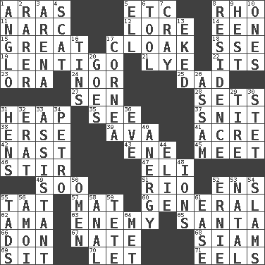 ACROSS 1. Ancient river in northeast Turkey 5. And so on (abbr.) 8. 17th letter of the Greek alphabet 11. Drug cop 12. Old wives' tales, e.g. 14. Car or cant ending 15. Relatively large 17. Hide under a false appearance 18. Compass dir. 19. Small, flat, pigmented spot on the skin 21. Sodium hydroxide 22. ___ a Wonderful Life 23. Mouth or opening 24. Not either 25. Male parent 27. Elected rep. 28. Puts into a specified state 31. Pile 35. Observe 37. In a ____ (agitated or irritated) 38. Celtic language 39. Actress Gardner 41. 1/640 square mile 42. Political cartoonist Thomas 43. Compass dir. 45. Confront 46. Tumult 47. Biblical high priest 49. "Barney Miller" actor Jack 51. _ de Janeiro 52. Followers of ems 55. Make lace 57. Floor covering 60. Commissioned military rank 62. Wet nurse (var.) 63. Foe 65. Before Barbara or Clara 66. Spanish title 67. Nathan's nickname 68. Thailand, formerly 69. Be seated 70. Allow 71. Snakelike fish DOWN 1. White American of non-Hispanic descent 2. Less widely known 3. Sports stadium 4. Leave at once 5. Pipe bend 6. Instrument 7. Supercomputer manufacturer 8. Dwelling 9. Behest 10. Washington bills 13. Made supply last 16. Airtight sealed metal containers 17. Pupil covering 20. Moves 26. Indian state 29. Become fatigued 30. Proofreading order 31. Coop moms 32. Part of Q.E.F. 33. Helper 34. Stone: prefix 36. Night before a holiday 40. Disorder of the immune system 44. Writer Wiesel 48. Charged atoms 50. Sign of things to come 52. Bert's buddy 53. Relating to or accompanying birth 54. Criticizes harshly 55. Small amounts or degrees 56. Mine, in Marseilles 58. Of or related to the anus 59. False hair 61. Comfort 64. Was introduced to