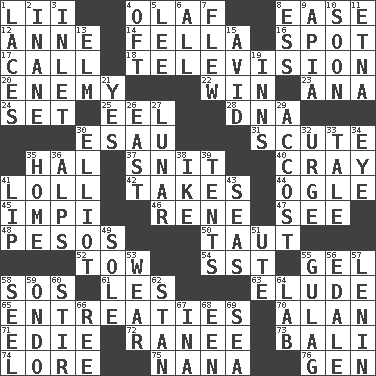 ACROSS 1. Cards in a Roman deck? 4. Norwegian king 8. Relaxation 12. Queen of England 1702-14 14. Chap (slang) 16. Blemish 17. Give a ring to 18. Household entertainment appliance 20. Foe 22. Acquire through effort 23. Santa ___, CA 24. Arrange properly for use 25. Snakelike fish 28. Heredity factor (abbr.) 30. He sold his birthright 31. Snake scale 35. Actor Linden 37. In a ____ (agitated or irritated) 40. Supercomputer manufacturer 41. Hang loosely or laxly 42. Proceeds 44. Stare 45. Body of Kaffir warriors 46. French philosopher Descartes 47. Perceive with the eye 48. Mexican monetary units 50. Pulled tight 52. Pull behind 54. Fast jet (abbr.) 55. Set 58. Mayday 61. French article 63. Dodge 65. Pleas 70. Actor Alda or Thicke 71. Singer Brickell 72. The wife of a rajah (variant) 73. Indonesian resort city 74. Old wives' tales, e.g. 75. Grandmother 76. Commissioned military rank (abbr.) DOWN 1. Shoestrings 2. Lacking in sense or substance 3. An arm off of a larger body of water 4. Often (poetically) 5. Area sheltered from the wind 6. 100% 7. Soared 8. Double-curved letter 9. Capital of Western Samoa 10. Within a short period 11. Inactive volcano in Sicily 13. Shade tree 15. Enthusiastic 19. Taverns 21. Consenting reply 26. 90 degrees 27. Type of eclipse 29. Buttonhole 30. American author Paul (1891-1958) 32. Goad 33. Falsehood 34. Sight organ 35. Residence 36. High mountains 38. D.D.E's nickname 39. Portable shelters 41. Mouth edge 43. Oceans 49. Flatfish 51. Shoshoni 53. Put on (as clothing) 55. POW camp 56. Peak District village in England 57. Soviet premier 1918-24 58. Stitch closed the eyes of (a falcon) 59. Southwest Nigerian state 60. Use a swizzle stick 62. Comedian Laurel of Laurel & Hardy 64. Experiment locale 66. To separate or throw off 67. _ tizzy (2 wds.) 68. Car or cant ending 69. Ocean