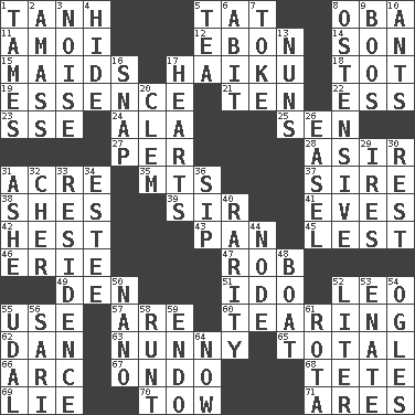 ACROSS 1. Hyperbolic tangent 5. Make lace 8. Chief or king in Benin or Nigeria 11. Mine, in Marseilles 12. Inky black, to poets 14. Manchild 15. Women servants 17. Japanese verse 18. Small child 19. Core 21. "___ Little Indians" 22. Double-curved letter 23. Compass dir. 24. Wing 25. Elected rep. 27. For each 28. SW Saudi Arabia district 31. Measure of real estate 35. Mountains (abbr.) 37. Father 38. "______ My Girl" (Turtles hit) 39. Title for a knight 41. Nights before holidays 42. Command 43. Baking dish 45. For fear that 46. 4th largest of the Great Lakes 47. Director Reiner 49. Lair 51. Wedding promise 52. Lion 55. Purpose 57. "We ___ not amused" (Victoria) 60. Rending 62. One of the 12 tribes of Israel 63. Pet term 65. Add up to 66. Curve 67. Southwest Nigerian state 68. Wig 69. Falsehood 70. Pull behind 71. Ancient Greek god of war DOWN 1. Corrects by punishment or discipline 2. Collect or gather 3. Annoying sound 4. Flintstone garb 5. Afternoon social gathering 6. "This won't hurt ____!" 7. Puff or smoke 8. Clearly or manifestly demonstrative 9. Expressions of contempt or scorn 10. Pismires 13. Religious women 16. Fastener 17. Centers of feelings and intuitions 20. Clement's nick name 26. Artist's stand 29. Angers 30. Remainder 31. American tennis player Robert 32. "Mermaids" star 33. Home 34. First name in cosmetics 36. Small drink 40. Noteworthy scarcity 44. Connecting point 48. Water vessel 50. Billionth: prefix 52. 61 cubic inches 53. Maternal 54. Stares at amorously 55. Hereditary estate 56. Indian skirt 58. The smallest animal of a litter 59. Inside; within (prefix) 61. Round or rotation of duties 64. Immediately