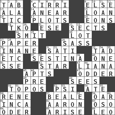 ACROSS 1. Bar bill 4. High-altitude cloud 9. Otherwise 13. Insect wing 14. Approach 15. Grant temporary use of 16. Nervous spasm 17. Schemes 18. Immeasurably long periods of time 19. Ring climax 21. Compass dir. 22. Religious groups 24. Stricken, poetically 26. Car dealer's back yard 27. Some stationery 29. Backtalk 30. Lacking in sense or substance 31. Suttee (variant) 33. Small amount or degree 36. And so on (abbr.) 37. French poetic form 40. Single 41. Compass dir. 42. Play the lead 43. Climbing, woody, usually tropical vines 45. Flats, for short 47. More peculiar 48. Before (prefix) 49. Perceives with the eye 50. Traditional theme or motif 52. 23rd letter of the Greek alphabet 54. Had dinner 56. French philosopher Descartes 57. Memphis, Tenn. Street 59. Boat paddle 61. South American Indian 62. Composer Copland 63. Bear (Spanish) 64. Baltic tributary 65. Get up 66. Lion DOWN 1. Make lace 2. Set down 3. Keyboard key 4. Head covering 5. An arm off of a larger body of water 6. Vintage cars 7. Pace 8. Big collection agency 9. Chooses 10. Spoils 11. Without 12. Followers of ems 20. Presage 22. Killed 23. Greek goddess of the dawn 25. Angers 27. Sliced desserts 28. Pismires 29. Use a swizzle stick 31. Fast planes 32. _ moment's notice (2 wds.) 33. Inedible or poisonous agaric 34. Queen of England 1702-14 35. Letter starter 38. _____ Park, CO 39. _ vera 44. The main thing one is thinking about 45. Seem 46. Adept person 49. Grain storage towers 50. Look after 51. At one time in the past 52. Lightbulb-shaped fruit 53. Indian skirt 55. Comfort 56. River (Sp.) 57. Sound made by sheep 58. Compass dir. 60. Friend of Pooh