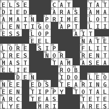 ACROSS 1. Otherwise 5. Feline 8. Make lace 11. Passed on 12. Caspian sea tributary 14. Wet nurse (var.) 15. With great haste 17. A-one 18. Car dealer's back yard 19. Small, flat, pigmented spot on the skin 21. Fitting 22. Cards in a Roman deck? 23. Curvy letter 24. Trim (branches) 25. Small island 27. Snakelike fish 28. Nathan's nickname 31. Old wives' tales, e.g. 35. Small drink 37. Sudden quick movement 38. Angers 39. And not 41. Monthly bill 42. Vertical spar for supporting sails 43. Scottish cap 45. Toward the sea 46. Writer Wiesel 47. Director Reiner 49. Lair 51. Wedding promise 52. Lion 55. Born 57. Begley and Asner 60. Separating forcefully 62. Car or cant ending 63. Likely to tip or tilt 65. "_____ Recall" 66. Curve 67. Afternoon social gatherings 68. False hair 69. Potassium hydroxide 70. Medical imaging device (abbr.) 71. Ancient Greek god of war DOWN 1. Peak District village in England 2. Citrus fruits 3. Actors Connery and Penn 4. Prepare for publication 5. 4-wheeled motor vehicle 6. Operatic vocal solo 7. Pack (down) 8. Baron Munchausen's specialties 9. Mine, in Marseilles 10. Jacques of French films 13. Stalk of a moss capsule 16. The longest river in the world 17. Cotton for raincoats, e.g. 20. Travels 26. Kind of red light 29. Prong on a fork 30. Singer James 31. Welles in "The Third Man" 32. Of the mouth 33. Dwelling 34. First name in cosmetics 36. Plant holder 40. Noteworthy scarcity 44. Method 48. Water vessel 50. Remaining after all deductions 52. 61 cubic inches 53. Related on the mother's side 54. Stares at amorously 55. Anneal 56. Suggestive of the supernatural 58. South Vietnam president (1954) 59. Practice fight 61. Round or rotation of duties 64. 23rd letter of the Greek alphabet