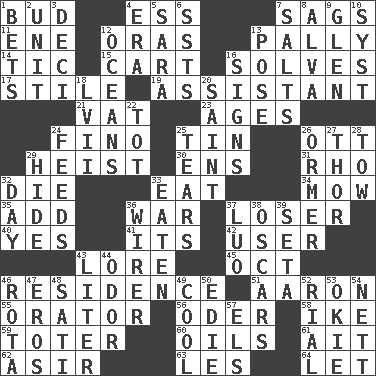 ACROSS 1. Partially opened flower 4. Double-curved letter 7. Sinks 11. Compass dir. 12. Mouths or openings 13. Chummy 14. Nervous spasm 15. Draw slowly or heavily 16. Finds the solution 17. Vertical member of a panel or frame 19. Aide 21. Large container 23. Ripens 24. A pale, very dry sherry 25. Metal container 26. Baseball player Mel 29. Robbery 30. Followers of ems 31. 17th letter of the Greek alphabet 32. Expire 33. Erode 34. Cut the grass 35. Find the sum of 36. Armed conflict 37. Failure 40. Consenting reply 41. It is 42. One who uses or employs something 43. Old wives' tales, e.g. 45. Sep. follower 46. Home 51. Composer Copland 55. Speaker 56. Baltic tributary 58. Eisenhower's nickname 59. Carrier 60. Petroleums 61. Small island 62. SW Saudi Arabia district 63. French article 64. Allow DOWN 1. Antes 2. A single undivided whole 3. Tenth: prefix 4. Period 5. "Two Mules for Sister ____" 6. Fast planes 7. Table seasonings 8. Inventor's middle name 9. Small, secluded valley 10. System (abbr.) 12. Seas 13. Airs 16. Attaches a signature 18. 57 in ancient Rome 20. Virtuous person 22. Small child 24. Gives food to 25. Lacerates 26. Abalone 27. Son of Odin 28. Pull behind 29. Flintstone garb 32. 24 hours 33. Ingested 36. One who wires 37. Nilotic language 38. Motion picture awards 39. Stalk of a moss capsule 43. 61 cubic inches 44. Aroma 46. Roll call or roster of names 47. Greek god of love 48. Suttee (variant) 49. Calm and collected 50. Singer Brickell 52. Monetary unit of Yemen 53. Migrant worker of the '30s 54. Remaining after all deductions 57. Raised railways