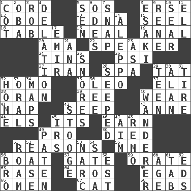 ACROSS 1. Drawstring 5. Distress signal 8. Celtic language 12. Mitch Miller's instrument 13. Pulitzer Prize-winning author Ferber 15. Stitch closed the eyes of (a falcon) 16. Eating place 18. Be tempered by heat 19. Of or related to the anus 20. Housemaid (var.) 22. Orator 24. Canisters 26. 23rd letter of the Greek alphabet 27. SW Asia republic 28. Health resort 29. Make lace 32. Like (prefix) 35. Butter sub 37. Biblical high priest 38. Northwest Algerian city 39. To sift 40. Put on (as clothing) 41. Atlas unit 42. Ooze 43. Queen of England 1702-14 44. Raised railways 45. It is 46. Merit 49. Adept person 50. Passed on 51. Thinks logically 55. Madame (abbr.) 56. Water vessel 57. Yard entry 59. Speak pompously 63. To erase 64. Greek god of love 65. Mild oath 66. Sign of things to come 67. Feline 68. Confederate soldiers (slang) DOWN 1. Small bed 2. Chief or king in Benin or Nigeria 3. Director Reiner 4. Conveyance 5. Elected rep. 6. Lyric poems 7. Fastener 8. 1973 Nobel Price Winner (Physics) Leo 9. French philosopher Descartes 10. Burn superficially 11. Pipe bend 14. City in Syria 17. Independent ruler or chieftain 21. Santa ___, CA 23. White ___ sheet 25. Sounds asleep 28. Oozed 29. Adolescent 30. ____ Jay Lerner 31. Become fatigued 32. Residence 33. Spoken 34. Atlas contents 36. Area sheltered from the wind 40. Nomad 42. Moe Howard, for one 45. Big collection agency 47. Direct toward a target or goal 48. San ____ (Riviera town) 49. Eucharist need 51. Wander 52. Comfort 53. Drug cop 54. Portico 56. Sis' sibling 58. Eastern Standard Time (abbr.) 60. Personal question 61. Bar bill 62. Begley and Asner