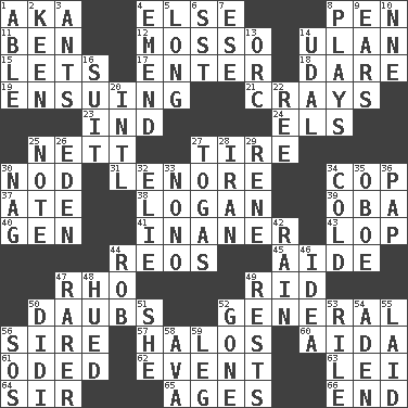 ACROSS 1. Alias (abbr.) 4. Otherwise 8. Fenced enclosure 11. Benjamin's nick name 12. With motion or animation 14. Uhlan (variant) 15. Allows 17. Keyboard key 18. Have the gumption 19. Following as a consequence or result 21. Trading vessels 23. Indiana (abbr.) 24. Raised railways 25. Remaining after all deductions 27. Become fatigued 30. Lower and raise head in agreement 31. Poe poem 34. Police officer (slang) 37. Had dinner 38. Utah city north of Ogden 39. Chief or king in Benin or Nigeria 40. Commissioned mil. rank 41. Sillier 43. Trim (branches) 44. Vintage cars 45. Assistant 47. 17th letter of the Greek alphabet 49. To free from 50. Applies to a surface 52. Commissioned military rank 56. Title for a man of rank and authority 57. Auras 60. Opera by Verdi 61. Wrote a lyric poem 62. Incident 63. Luau accessory 64. Title for a knight 65. Ripens 66. Conclusion DOWN 1. Competent 2. Peachy ____! 3. Pismires 4. Make improvements or corrections to 5. Yearn 6. Fast jet (abbr.) 7. Compass dir. 8. Frolics 9. Hearing organs 10. Compass dir. 13. The grampus (Milton) 14. Freehold land 16. Set or collection 20. International (abbr.) 22. To sift 25. Brief written record 26. Locale of original sin 27. Ancient Roman robes 28. SW Asia republic 29. French philosopher Descartes 30. Tired old horse 32. Writer Wiesel 33. Words to Nanette 34. Having a low temperature 35. Mitch Miller's instrument 36. Infant food 42. Precipitation 44. Director Reiner 46. The content of cognition 47. More uncommon 48. Became colored 49. Musical pauses 50. "You Light Up My Life" star Conn 51. A female animal or person 52. Went 53. Cause heat under the collar 54. An important port of Yemen 55. Put down 56. Distress signal 58. Actress Gardner 59. Part of a journey