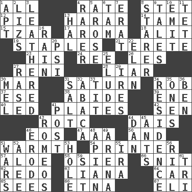 ACROSS 1. Everything 4. Pace 8. Proofreading order 12. Sliced dessert 13. Ethiopian city, capital of Harari 14. Not wild 15. Russian ruler 17. Scent 18. Set down 19. Paper fasteners 21. Cylindrical with tapered ends 23. Part of HMS, perhaps 24. To separate or throw off 26. French article 27. Painter Guido (1575-1642) 28. One who doesn't tell the truth 30. Spoil 31. Titan orbits this 34. Director Reiner 37. Compass dir. 38. Stay 39. Compass dir. 40. Directed 41. Food holders 42. Elected rep. 43. College mil. group 44. Raised platform 46. Greek goddess of the dawn 47. Auto club (abbr.) 50. Added to 51. Heat 54. Hard copy producer 57. Medicinal plant 58. Flexible twig of a willow tree 60. In a ____ (agitated or irritated) 62. Make new 63. Climbing, woody, usually tropical vines 64. Auto 65. Observes 66. Inactive volcano in Sicily 67. Connecticut Ivy Leaguer DOWN 1. Fitting 2. Belonging to Elizabeth 3. Tough but pliablecoriaceous 4. More uncommon 5. Came up 6. Scottish cap 7. Part of Q.E.F. 8. A viewer who gazes fixedly 9. Stories 10. Send forth 11. Wig 13. Actor Linden 16. Water falling in drops from the sky 20. Air pressure measure (abbr.) 22. Style 25. Evade 27. To erase 29. Angers 30. Cartoonist voice _ Blanc 31. Table seasoning 32. Phillipine bananalike plant 33. Teat (slang) 34. Dwelling 35. Washington bills 36. Benjamin's nick name 41. Mail 43. Lover boys 44. Daniel's nick name 45. Pismires 46. Eat (away) 48. Bee-related 49. Sports stadium 51. Armed conflicts 52. Toward shelter 53. Opening into or through something 55. Lyricist Gershwin 56. Monetary unit of Yemen 59. Be seated 61. Three (prefix)