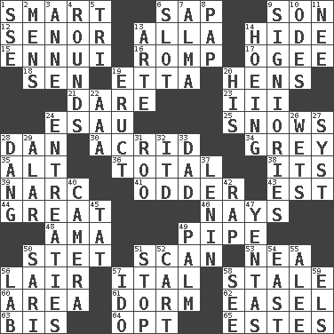 ACROSS 1. Don Adams' spy role 6. Plant excrement 9. Male child 12. Sir (Sp.) 13. Silent film actress Nazimova 14. Flintstone garb 15. World-weariness 16. Frolic 17. Double curve, resembling the letter S 18. Elected rep. 19. Singer James 20. Coop moms 21. Have the gumption 23. One more than two 24. He sold his birthright 25. Frozen precipitation (plural) 28. Daniel's nick name 30. Sour-tasting 34. Jennifer or Joel 35. Keyboard modifier key 36. "_____ Recall" 38. ___ a Wonderful Life 39. Drug cop 41. More peculiar 43. Eastern Standard Time (abbr.) 44. Relatively large 46. Negative votes 48. Wet nurse (var.) 49. Corncob 50. Proofreading order 51. Skim 53. Teachers' org. 56. Den 57. Slanted text style (abbr.) 58. Lacking originality or spontaneity 60. Length times width 61. Dormintory (informal) 62. Artist's stand 63. Twice 64. Elect 65. _____ Park, CO DOWN 1. Compass dir. 2. Not women's 3. Singer Murray 4. Periods in a boxing match 5. Three (prefix) 6. Groove 7. _ mater 8. Infant food 9. Seigniories (variant) 10. Lyric poems 11. Born 13. Johnson of "Laugh-In" 14. Cultivating 19. Spew [out] 20. Part of HMS, perhaps 22. Auto club (abbr.) 24. Pleas 26. Moistens 27. System (abbr.) 28. Mild oath, euphamism for damn 29. Having or resembling wings 31. Friend of Pooh 32. It would 33. June honoree 37. Soviet premier 1918-24 40. Device for capturing images 42. Reproach for some lapse or misdeed 45. Make lace 47. Gossips 49. Inside of hand 50. Indian skirt 51. Halt 52. Haul 54. Compass direction 55. Toward shelter 56. Experiment locale 57. Wedding promise 58. Observe 59. Raised railways