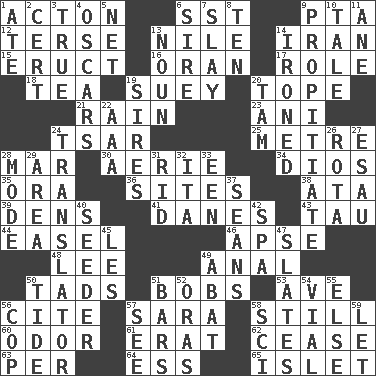 ACROSS 1. 13-14th century defensive garment 6. Fast jet (abbr.) 9. Parent Teacher Assoc. 12. Laconic 13. The longest river in the world 14. SW Asia republic 15. Spew [out] 16. NW Algerian seaport 17. Hero or heavy, e.g. 18. Afternoon social gathering 19. Chop _ 20. Drink excessively 21. Water falling in drops from the sky 23. Black tropical American cuckoo 24. Russian ruler of old 25. Distance measurement (Brit.) 28. Third mo. 30. Nest on high 34. "Vaya con ____" 35. Mouth or opening 36. Settings 38. _ moment's notice (2 wds.) 39. Lairs 41. Natives or inhabitants of Denmark 43. The 19th letter of the Greek alphabet 44. Artist's stand 46. Domed church section 48. Area sheltered from the wind 49. Of or related to the anus 50. Small amounts or degrees 51. Moves up and down 53. "___ Maria" 56. Quote 57. "Two Mules for Sister ____" 58. Free of sound 60. Aroma 61. Part of Q.E.F. 62. Stop 63. For each 64. Double-curved letter 65. Small island DOWN 1. Had dinner 2. An absolute certainty 3. Loyal 4. Motion picture awards 5. Fish or hair follower 6. The founder of a family 7. Kill 8. Nine, plus one 9. Appease 10. Story 11. A saturated hydrocarbon 13. Part of speech 14. Pressed 19. Male parents of animals 20. Scottish cap 22. Auto club (abbr.) 24. Interpreter 26. Round or rotation of duties 27. He sold his birthright 28. Method 29. Type of rug 31. To free from 32. Call ___ day 33. Car or cant ending 37. Seines 40. Sowing specialist 42. Health resort 45. French article 47. Chalkboards 49. Blind as ____ 50. Event that recurs at intervals 51. Oblong pieces of solid material 52. Mouths or openings 54. Small bottle 55. Otherwise 56. Police officer (slang) 57. Perceive with the eye 58. _-fi 59. Allow