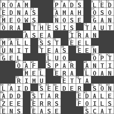 ACROSS 1. Wander 5. Writing tablets 9. Directed 12. Ferber et al. 14. Nursemaid 15. Bear (Spanish) 16. Catcalls? 17. Sense of smell 18. Separate the seeds from cotton 19. Mouth or opening 20. College paper 23. Tense 24. At sea 25. SW Asia republic 27. Shopping center 30. Fast jet (abbr.) 32. Snakelike fish 33. A single undivided whole 34. Beverages made from leaves 36. Car or cant ending 38. Set 39. Nilotic language 40. Choose 43. Clumsy lout 46. Practice fight 48. Against 49. Cartoonist voice _ Blanc 51. Period 52. Grant temporary use of 53. Tall New Zealand timber tree 54. Singer James 56. Put down 58. Sowing specialist 61. Manchild 64. Find the sum of 65. Play the lead 66. Peak District village in England 68. Last letter of the English alphabet 69. Blunders 70. Fencing necessities 71. Followers of ems 72. Relaxation 73. Leave at once DOWN 1. San ____ (Riviera town) 2. Baltic tributary 3. Small Philippine buffalo 4. Informal term for the mouth 5. Zero-star reviews 6. Mine, in Marseilles 7. Hyrax 8. A female animal or person 9. Utah city north of Ogden 10. He sold his birthright 11. Do not 13. Fast planes 21. Behest 22. Artist's stands 23. Story 24. Keyboard modifier key 26. To riddle 27. Large cup 28. A saturated hydrocarbon 29. _ and Stitch 31. Grayish beige 35. Flew 37. Words to Nanette 41. Parent Teacher Assoc. 42. Metal container 44. Among 45. Opposite of masc. 47. Assign a rank or rating to 48. Wing 50. A period of five years 53. Amusement-park features 55. Unclean, religiously 56. Goldbrick 57. An important port of Yemen 59. Hearing organs 60. Celtic language 61. Ketch in the Levant 62. Spanish pot 63. A home for chicks 65. Perceive with the eye 67. Two (Sp.)
