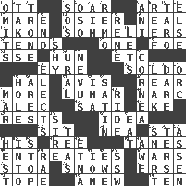 ACROSS 1. Baseball player Mel 4. Fly high 8. Johnson of "Laugh-In" 12. Female horse 14. Flexible twig of a willow tree 16. Actress Patricia 17. Visual representation of an object 18. Wine waiters 20. Watches over 22. Single 23. Enemy 24. Compass dir. 25. Attila the _ 28. And so on (abbr.) 30. Jane of fiction 31. Twentieth part of a lira 35. Actor Linden 37. Deliberation 40. Posterior 41. Greater amount 42. Type of eclipse 44. Drug cop 45. Actor Baldwin 46. Suttee (variant) 47. Supplement with great effort 48. Musical pauses 50. The content of cognition 52. Be seated 54. Teachers' org. 55. R.R. building 58. Part of HMS, perhaps 61. Portuguese money of account (variant) 63. Domesticates 65. Pleas 70. Armed conflicts 71. Portico 72. Frozen precipitation (plural) 73. Celtic language 74. Drink excessively 75. Afresh 76. "___ Little Indians" DOWN 1. Leaves out 2. Proceeds 3. Marketplace scale 4. Mayday 5. Bear (Spanish) 6. Direct toward a target or goal 7. San ____ (Riviera town) 8. Black tropical American cuckoo 9. Coral collection 10. Edible starchy tuberous root 11. Otherwise 13. Conclusion 15. French philosopher Descartes 19. Allows 21. Like a shrinking violet 26. Mountain range 27. Mole, birthmark 29. Pupil covering 30. Chooses 32. Path through which fluid escapes 33. Have the gumption 34. The grampus (Milton) 35. Hollow 36. Ancient Greek god of war 38. _ tizzy (2 wds.) 39. Smooth fabric 41. Spoil 43. Travel on or in a vehicle 49. Beget 51. Ingest 53. Beverages made from leaves 55. Don Adams' spy role 56. Laconic 57. NE Netherlands city 58. Behest 59. To the inside or interior of 60. Discontinue 62. Inactive volcano in Sicily 64. Deep reverence 66. Actress Charlotte 67. Electrically charged atom 68. She-sheep 69. Compass dir.