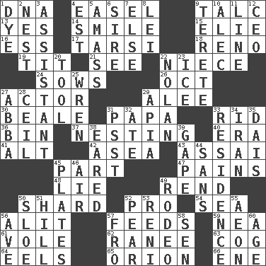ACROSS 1. Heredity factor (abbr.) 4. Artist's stand 9. Baby powder 13. Affirmative reply 14. Grin 15. Writer Wiesel 16. Curvy letter 17. Tarsus (plural) 18. Former U.S. Attorney General Janet 19. Teat (slang) 21. Perceive with the eye 22. Sibling's daughter 24. Sty mamas 26. Sep. follower 27. Thespian 29. Toward shelter 30. Calif. Air Force Base 31. Dad 33. To free from 36. Storage container 37. Snuggling 40. Epoch 41. The first octave above the treble staff 42. At sea 43. Slender Brazilian palm 45. Role in a play 47. Aches 48. Falsehood 49. Tear apart 50. Pottery fragment 52. Adept person 54. Ocean 56. Came down and settled, as after flight 57. Gives food to 59. Teachers' org. 61. Short-tailed, large-bodied rat 62. Indian princess (variant) 63. Gear tooth 64. Snakelike fish 65. Constellation of myth 66. Compass dir. DOWN 1. Color 2. Egg locale 3. Helper 4. Eastern Standard Time (abbr.) 5. Collect or gather 6. The founder of a family 7. Otherwise 8. Flowery wreath 9. Cylindrical with tapered ends 10. Actor Baldwin 11. Actor's bit 12. Corporate head (abbr.) 20. Utensil 22. Pitcher Ryan 23. Frozen water 25. Songbird 27. Swedish rock group 28. To provide with a ceiling 29. Capital of Western Samoa 31. Inconspicuous attention getter 32. Had dinner 33. Dwelling 34. SW Asia republic 35. Raised platform 38. Having ears or earlike features 39. Open wide 44. Without 45. Food holders 46. Wind 49. Cowboy competition 50. _ gin 51. Land elevation 52. Lightbulb-shaped fruit 53. Painter Guido (1575-1642) 55. A really long time 56. "___ Maria" 57. Away 58. Elected rep. 60. Ripen