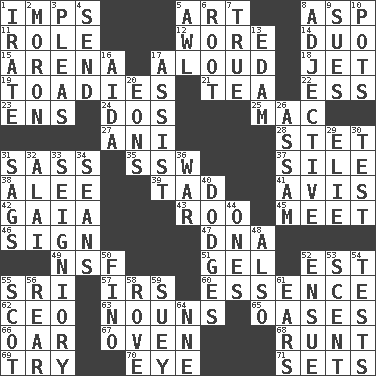 ACROSS 1. Naughty children 5. Nonscientific branch of learning 8. Cleo's killer 11. Hero or heavy, e.g. 12. Had on 14. Superhero pair 15. Sports stadium 17. Verbally 18. Passenger plane 19. Sycophants 21. Beverage made from leaves 22. Double-curved letter 23. Followers of ems 24. Two (Sp.) 25. Apple computer (short form) 27. Cuckoo 28. Proofreading order 31. Backtalk 35. Compass dir. 37. Drop; flow; fall 38. Toward shelter 39. Small boy 41. Deliberation 42. Greek goddess of the earth (variant) 43. Friend of Pooh 45. Confront 46. Public display of a written message 47. Heredity factor (abbr.) 49. Science/research agcy. 51. Set 52. Eastern Standard Time (abbr.) 55. Indian title of respect (Mr.) 57. Big collection agency 60. Center 62. Corporate head (abbr.) 63. Parts of speech 65. Fertile tracts in a desert 66. Boat paddle 67. Baking chamber 68. Undersized animal 69. Attempt to accomplish something 70. Sight organ 71. Arranges properly for use DOWN 1. Feeling or showing extreme anger 2. Person of subnormal intelligence 3. Entreaties 4. Post 5. Leather borer 6. Carrot, for example 7. Loyal 8. Descriptive word 9. Institutes legal proceedings 10. Plant holders 13. Dutch treat 16. Opera by Verdi 17. Aid 20. Immeasurably long periods of time 26. Indian state 29. Writer Wiesel 30. Trial 31. Droops 32. Jai ____ 33. Signiory (variant) 34. Seines 36. Armed conflict 40. Evades 44. Washington bills 48. In addition 50. A pale, very dry sherry 52. Take place subsequently 53. Odor 54. Trials 55. Highlander 56. Buttocks 58. Be footloose 59. Chop _ 61. Hearing organs 64. Compass dir.