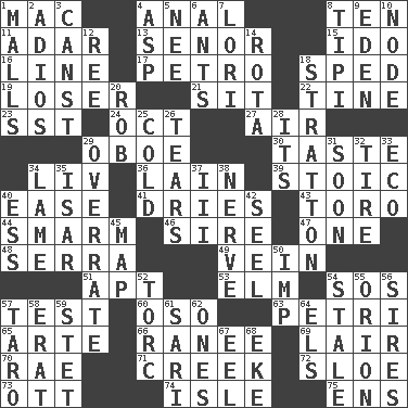 ACROSS 1. Big _ 4. Of or related to the anus 8. Nine, plus one 11. The sixth month of the Jewish calendar 13. Sir (Sp.) 15. Wedding promise 16. Actor's bit 17. Stone: prefix 18. Hurried 19. Failure 21. Be seated 22. Prong on a fork 23. Fast jet (abbr.) 24. Sep. follower 27. Atmosphere 29. Mitch Miller's instrument 30. Clothes sense 34. 54 in ancient Rome 36. (Had) reclined 39. Unemotional 40. Comfort 41. Frees from moisture 43. "Corrida" creature 44. Excessive but superficial compliments 46. Beget 47. Single 48. Spanish missionary in California 49. Distinctive style or manner 51. Fitting 53. Shade tree 54. Mayday 57. Trial 60. Bear (Spanish) 63. _ dish (used to culture cells) 65. Johnson of "Laugh-In" 66. The wife of a rajah (variant) 69. Den 70. Actress Charlotte 71. Small stream 72. A type of plum 73. Baseball player Mel 74. Capri or Wight 75. Followers of ems DOWN 1. Shopping centers 2. Goodbye (Sp.) 3. 2nd pers. sing. pres. of can (arch.) 4. Viper 5. Born 6. Pismires 7. Australian parrot (variant) 8. Native american tent (variation) 9. Paradise 10. Connecting point 12. To separate or throw off 14. Round or rotation of duties 18. Ski resort town in Vermont 20. Director Reiner 25. Lacking warmth 26. Pulls into pieces 28. ___ a Wonderful Life 29. Make much ado about nothing 31. Within a short period 32. Hoop that covers a wheel 33. Environmental prefix 34. Unable to walk 35. Austrian river, tributary to the Danube 37. One more than two 38. Boldness 40. Curvy letter 42. Stitch closed the eyes of (a falcon) 45. Atlas unit 50. Naughty child 52. Torque (variant) 54. Showing deterioration from age 55. Constellation of myth 56. Fathers 57. Pacific island yam 58. Part of Q.E.F. 59. Proofreading order 61. Indian skirt 62. Singles 64. Raised railways 67. Snakelike fish 68. Make supply last