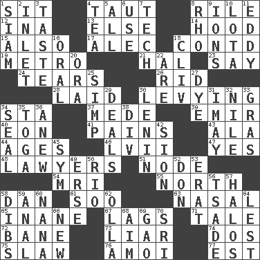 ACROSS 1. Be seated 4. Tense 8. Cause heat under the collar 12. _ tizzy (2 wds.) 13. Otherwise 14. Parka part 15. In addition 17. Actor Baldwin 18. Continued (abbr.) 19. Paris' subway 21. Actor Linden 23. Declare 24. Rends 26. To free from 28. Put down 30. Imposing or collecting, as a tax 34. R.R. building 37. Ancient Persian 39. Arab leader 40. Period of immesurable duration 41. Aches 43. In the manner of 44. Eras 46. 57 in ancient Rome 47. Consenting reply 48. Those who practice law 51. Connecting point 54. Medical imaging device (abbr.) 55. 0 degrees 58. One of the 12 tribes of Israel 61. "Barney Miller" actor Jack 63. Rhinal 65. Lacking in sense or substance 67. Fails to keep up a pace 71. Story 72. Object of repulsion 73. One who doesn't tell the truth 74. Two (Sp.) 75. Cole _ (cabbage dish) 76. Mine, in Marseilles 77. Eastern Standard Time (abbr.) DOWN 1. Thailand, formerly 2. An arm off of a larger body of water 3. Clothes sense 4. Afternoon social gathering 5. 100% 6. Purpose 7. Technician 8. 17th letter of the Greek alphabet 9. Charged atoms 10. Globular water bottle used in Asia 11. Whirlpool 16. Of the mouth 18. 154 in Roman numerals 20. Mouth or opening 22. "We ___ not amused" (Victoria) 25. Simple or foolish person 27. Color 29. Allots cards 30. Soviet premier 1918-24 31. "If ____ say so..." 32. "Death on the ____" 33. Pate de foie ____ 34. Lick closed 35. Ancient Roman robe 36. Afresh 38. HTML Container Element 42. The Jewish people; Israel 45. Symbol (abbr.) 49. Celtic language 50. _ de Janeiro 52. Spanish title 53. Part of Q.E.F. 56. Sadhe (variant) 57. Saint headwear 58. Rights 59. Of or related to the anus 60. Grandmother 62. Spanish pot 64. For fear that 66. ___ Haven, CT 68. Direct toward a target or goal 69. E Mali city 70. Indian title of respect (Mr.)