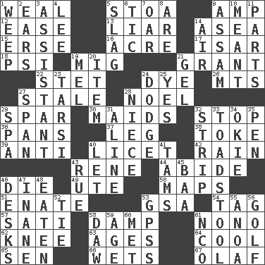 ACROSS 1. Welt 5. Portico 9. Electrical Unit 12. Relaxation 13. One who doesn't tell the truth 14. At sea 15. Celtic language 16. Measure of real estate 17. Austrian river, tributary to the Danube 18. 23rd letter of the Greek alphabet 19. Russian fighter aircraft 21. Monetary aid 22. Proofreading order 24. Color 26. Mountains (abbr.) 27. Showing deterioration from age 28. Christmas carol 29. Practice fight 30. Unmarried girls 32. Close up, plug up 36. Zero-star reviews 37. Part of a journey 38. Puff or smoke 39. Opposed to 40. It is permitted: Lat. 42. Precipitation 43. French philosopher Descartes 44. Remain 46. Expire 49. Shoshoni 50. Atlas contents 51. Maternal 53. Girls' org. (abbr.) 54. Label 57. Suttee (variant) 58. Moist 61. Words to Nanette 62. Leg joint 63. Grows older 64. Calm and collected 65. Elected rep. 66. Moistens 67. Norwegian king DOWN 1. Shed a tear 2. Hearing organs 3. Helper 4. Area sheltered from the wind 5. Volcanic refuse 6. Nervous spasm 7. Rowing implement 8. "We ___ not amused" (Victoria) 9. Indian state 10. Intended 11. Actors' quests 14. Wind 19. Cartoonist voice _ Blanc 20. A whole individual unit 21. Set 23. Tarsus (plural) 24. Evade 25. Affirmative reply 27. Connect, as a bridge 28. Sibling's daughter 29. Health resort 31. Place in a line 32. Long narrow piece of something 33. Inedible or poisonous agaric 34. Migrant worker of the '30s 35. Fenced enclosure 40. Allow 41. Scottish caps 43. Sorrow 45. Sound made by sheep 46. Writing tables 47. Empty; void 48. Ingested 52. Neckwear 53. Global Positioning Systems (abbr.) 55. Small Philippine buffalo 56. _ course 58. Obsolete 59. Mature 60. Was introduced to 61. Non-commissioned officer (abbr.)