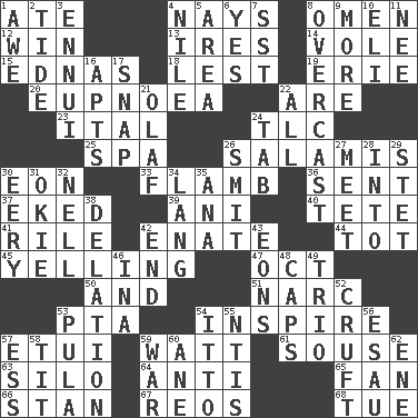ACROSS 1. Had dinner 4. Negative votes 8. Sign of things to come 12. Acquire through effort 13. Angers 14. Grand slam 15. Ferber et al. 18. For fear that 19. 4th largest of the Great Lakes 20. Normal relaxed breathing 22. "We ___ not amused" (Victoria) 23. Slanted text style (abbr.) 24. Affectionate concern, for short 25. Health resort 26. Deli grouping 30. A really long time 33. Flambe (short form) 36. Emitted 37. Supplemented with great effort 39. Cuckoo 40. Wig 41. Cause heat under the collar 42. Related on the mother's side 44. Small child 45. Crying or shouting loudly 47. Sep. follower 50. Added to 51. Drug cop 53. Parent Teacher Assoc. 54. Stimulate to action 57. Needle case 59. Electrical Unit 61. Boozer 63. Grain storage tower 64. Opposed to 65. Air blower 66. Comedian Laurel of Laurel & Hardy 67. Vintage cars 68. Third day of the wk. DOWN 1. Deep reverence 2. Periodic rise and fall of the sea level 3. World-weariness 4. Mediterranean tributary 5. Length times width 6. Consenting reply 7. Fast jet (abbr.) 8. Cloudy 9. Greater amount 10. Connecticut Ivy Leaguer 11. Born 16. Flats, for short 17. Fastener 21. Norwegian king 22. Everything 24. Keyboard key 26. Stricken, poetically 27. Confront 28. To the inside or interior of 29. Proofreading order 30. Suggestive of the supernatural 31. Migrant worker of the '30s 32. 1994 drama film starring Jodie Foster 34. Long (Scottish) 35. Santa ___, CA 38. Accusation by an informer 42. Conclusion 43. Immeasurably long periods of time 46. _ tizzy (2 wds.) 48. Balmoral and tarboosh 49. Musical group of three 52. An unpleasant substance 53. Monetary unit of Botswana 54. "Tell ____ the Marines!" 55. Nuclear Threat Initiatives 56. Son of Isaac 57. Curvy letter 58. Teat (slang) 59. Armed conflict 60. A saturated hydrocarbon 62. Compass dir.