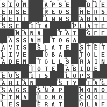 ACROSS 1. The Jewish people; Israel 5. Domed church section 9. Expire 12. Celtic language 13. Vintage cars 14. Possessive pronoun 15. Remaining after all deductions 16. Taverns 17. Blind as ____ 18. Compass dir. 19. Call ___ day 21. Food holder 22. Grandmother 24. Make lace 26. Turn to the right 27. Indian state 28. Ancient Roman robe 29. Advice 30. Schedule 32. Proofreading order 36. Moving, as bait 37. Chief or king in Benin or Nigeria 38. Lacquered or enameled metalware 39. Arabian gulf 40. For Whom the Bell _____ 42. Precipitation 43. Carryall 44. Tolerate 46. Greek goddess of the dawn 49. ___ a Wonderful Life 50. Chops off 51. Believer in; advocate of (suffix) 53. Filthy place 54. Label 57. Sinks 58. Fastener 61. Words to Nanette 62. Inactive volcano in Sicily 63. Like (prefix) 64. Calm and collected 65. French article 66. Part of Q.E.F. 67. Norwegian king DOWN 1. Elected reps. 2. Angers 3. Clearly or manifestly demonstrative 4. Fish or hair follower 5. Operatic vocal solo 6. Animal enclosure 7. Manchild 8. Double-curved letter 9. Debunk (Brit. slang) 10. Feeling or showing extreme anger 11. First name in cosmetics 14. Actor Linden 19. _ tizzy (2 wds.) 20. Scottish caps 21. Parent Teacher Association (abbr.) 23. NE Netherlands city 24. Add up to 25. Personal question 27. Enthusiastic 28. Eating place 29. Wing 31. Plunders 32. Long narrow piece of something 33. Inedible or poisonous agaric 34. Writer Wiesel 35. "___ Little Indians" 40. Small child 41. Table seasoning 43. Shallow baking pan 45. Male child 46. Artist's stand 47. Declaim 48. Public displays of written messages 52. White ___ sheet 53. Blemish 55. Small Philippine buffalo 56. Eighteen holes 58. A female animal or person 59. Not either 60. Nursemaid (var.) 61. Non-commissioned officer (abbr.)