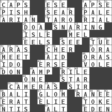 ACROSS 1. Balmoral and tarboosh 5. Compass dir. 8. Domed church section 12. Expression of disdain 13. Wither 15. Diluted with white 16. Believer in; advocate of (suffix) 18. Pacific island yam 19. Monetary unit of Yemen 20. ___ good deed 22. Catching in a trap 24. Small island 26. Cartoonist voice _ Blanc 27. Snakelike fish 28. Perceive with the eye 29. Third day of the wk. 32. Ancient river in northeast Turkey 35. "Mermaids" star 37. Mouth or opening 38. Rendezvous 39. Help 40. Mouths or openings 41. Wedding promise 42. Celtic language 43. Short-tailed, large-bodied rat 44. Spanish title 45. Electrical Unit 46. Cause heat under the collar 49. Single 50. Play the lead 51. Devices for capturing images 55. Title for a knight 56. Indonesian resort city 57. Seize upon or latch onto something 59. The wife of a rajah (variant) 63. Part of Q.E.F. 64. Writer Wiesel 65. Puff or smoke 66. Nuclear Threat Initiatives 67. Keyboard modifier key 68. Genesis locale DOWN 1. Tax preparer (abbr.) 2. Wind 3. Air pressure measure (abbr.) 4. Most questionable 5. Eastern Standard Time (abbr.) 6. Oceans 7. Merit 8. Showery time 9. Ache 10. Volcanic refuse 11. Snakelike fish 14. Nomad 17. Sense of smell 21. Everything 23. To sift 25. Fortification 28. Spring feasts 29. "Corrida" creature 30. Mountain range 31. Comfort 32. Among 33. Do over again 34. Age 36. Part of HMS, perhaps 40. Make much ado about nothing 42. Develop 45. One (Scot) 47. ___ a Wonderful Life 48. Den 49. Leaves out 51. Draw slowly or heavily 52. Jai _ 53. Silent film actress Nazimova 54. The visible part of the earth's surface 56. Benjamin's nick name 58. Was introduced to 60. Dreamland 61. Supplement with great effort 62. Car or cant ending