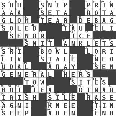 ACROSS 1. Quiet! 4. Clip 8. Demure 12. American Automobile Association (abbr.) 13. Bristle 14. Roll call or roster of names 15. Take by theft 17. Rend 18. Debunk (Brit. slang) 19. Having a sole or soles 21. The 19th letter of the Greek alphabet 23. Connecticut Ivy Leaguer 24. Sir (Sp.) 26. Frozen water 28. In a ____ (agitated or irritated) 30. Short socks 34. Indian title of respect (Mr.) 37. Soup holder 39. Australian parrot (variant) 40. 54 in ancient Rome 41. Lacking originality or spontaneity 43. Modern: prefix 44. Allodial 46. Like ___ of sunshine 47. Elected rep. 48. Commissioned military rank 51. Possessive pronoun 54. Pull behind 55. Settings 58. Yet 61. Afternoon social gathering 63. Middle Eastern gold or silver currency 65. From or relating to Ireland 67. Filth; sediment 71. Raze (variant) 72. Hindu god of fire 73. Leg joint 74. Metal container 75. Ooze 76. An important port of Yemen 77. Conclude DOWN 1. Sinks 2. Rings 3. White Person, in Hawaii 4. Fast jet (abbr.) 5. Born 6. Call ___ day 7. Role in a play 8. Before (prefix) 9. Loose flowing garment 10. Slanted text style (abbr.) 11. Wise men 16. Not women's 18. Evade 20. Spanish title 22. The 18th letter of the Arabic alphabet 25. Teases 27. Pipe bend 29. Add up to 30. Assad's deity 31. Immeasurably long periods of time 32. Woody plant 33. The Jewish people; Israel 34. Strike heavily 35. Travel on or in a vehicle 36. "Terrible" tsar 38. Armed conflict 42. Snake ____ (dice throw) 45. Allow 49. Writer of Portnoy's Complaint (1969) 50. Deep reverence 52. To free from 53. Agitate 56. Related on the mother's side 57. Indian antelope 58. Prejudice 59. Goad 60. Prong on a fork 62. "____ silly question..." 64. Tear apart 66. Small drink 68. Working for oneself (abbr.) 69. Area sheltered from the wind 70. Car or cant ending