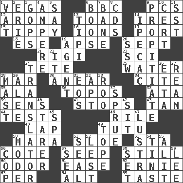ACROSS 1. Viva Las _ 6. English channel? 9. Personal Computers (abbr.) 12. Odor 13. Frog relative 14. Angers 15. Likely to tip or tilt 16. Charged atoms 17. Sweet dark-red dessert wine 18. Compass dir. 19. Domed church section 20. Back-to-school mo. 21. Swiss mountan, "Queen of the Mountains" 23. _-fi 24. Wig 25. Wetness 28. Spoil 30. Approach 34. Quote 35. Wing 36. Literary convention 38. _ moment's notice (2 wds.) 39. Elected reps. 41. Obstructs or blocks passage 43. Scottish cap 44. Trials 46. Cause heat under the collar 48. Infant locale 49. Ballerina skirt 50. Hindu Mythology: god of death 51. A type of plum 53. R.R. building 56. ____ d'Azur (French Riviera) 57. Ooze 58. Not moving 60. Aroma 61. Comfort 62. Bert's buddy 63. For each 64. Keyboard modifier key 65. Clothes sense DOWN 1. Large container 2. 4th largest of the Great Lakes 3. Republicans 4. Electrical Unit 5. Declare 6. Scornful sounds 7. Object of repulsion 8. Music discs 9. Conciliate 10. Certainty 11. Fast jet (abbr.) 13. Native american tent (variation) 14. Medicinal drug used to evoke vomiting 19. Representative 20. Compass dir. 22. Call ___ day 24. Interpreter 26. Singer James 27. 480, 500 or 516 sheets of paper 28. Vertical spar for supporting sails 29. Toward shelter 31. Greek goddess of the dawn 32. Fitting 33. Friend of Pooh 37. Disorder 40. A viewer who gazes fixedly 42. Be seated 45. Health resort 47. A period of five years 49. Drink excessively 50. Method 51. Lick closed 52. For fear that 54. Canisters 55. Set down 56. Police officer (slang) 57. Ocean 58. Arrange properly for use 59. Area sheltered from the wind
