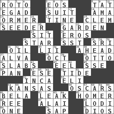 ACROSS 1. Printing process, for short 5. Greek goddess of the dawn 8. Make lace 11. Mild oath 12. Set of matching outer garments 14. Housemaid (var.) 15. Abalone 17. Prong on a fork 18. To starve (Brit.) 19. Sowing specialist 21. Place where plants grow 23. Be seated 25. Greek god of love 26. Play the lead 27. Fast jet (abbr.) 28. _ Lanka 31. Lubricate 33. Cards in a Roman deck? 35. Having the leading position 37. Inventor's middle name 38. Sep. follower 40. "Beetle Bailey" pooch 41. Thick slices 43. Snakelike fish 45. Compass dir. 46. Baking dish 47. Compass dir. 50. Event that recurs at intervals 52. South American Indian 53. Connecticut Ivy Leaguer 54. Sunflower state 56. Motion picture awards 61. Actor Lugosi 62. Path through which fluid escapes 65. Baseball hit which scores a run 66. To sift 67. Jai ____ 68. Farming town in central California 69. Single 70. Plant excrement 71. "Vaya con ____" DOWN 1. Vintage cars 2. Legendary monster 3. Not wild 4. Wrote a lyric poem 5. Eastern Standard Time (abbr.) 6. Fr. "Yes" 7. Scorches 8. Story 9. So be it 10. Scottish cap 13. Pulls into pieces 16. Respite 18. Music discs 20. Monetary unit of Yemen 22. Roll call or roster of names 24. Musical group of three 26. Thick slice 28. Arranges properly for use 29. Pace 30. Wedding promise 31. Water jar 32. _ the terrible 34. Frozen water 36. Stockings 37. Viper 39. Wig 42. Elected reps. 44. _ and Stitch 48. Any of the three canals of the cochlea 49. Artist's stands 51. Food container 52. _ tizzy (2 wds.) 54. Peachy ____! 55. Toward shelter 57. Chilled 58. Mine, in Marseilles 59. Do over again 60. Indian titles of respect 61. Sis' sibling 63. Auto club (abbr.) 64. Monetary unit of Laos