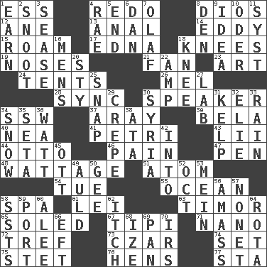 ACROSS 1. Double-curved letter 4. Do over again 8. "Vaya con ____" 12. A saturated hydrocarbon 13. Of or related to the anus 14. Whirlpool 15. Wander 17. Pulitzer Prize-winning author Ferber 18. Leg joints 19. Olfactory organs 21. Air blower 23. Nonscientific branch of learning 24. Portable shelters 26. Cartoonist voice _ Blanc 28. Synchronize (abbr.) 30. Orator 34. Compass dir. 37. Like ___ of sunshine 39. Actor Lugosi 40. Teachers' org. 41. _ dish (used to culture cells) 43. Cards in a Roman deck? 44. "Beetle Bailey" pooch 46. Ache 47. Writing instrument 48. Electrical Measurement 51. Tiny particle 54. Third day of the wk. 55. Sea 58. Health resort 61. Luau accessory 63. The easternmost of the Lesser Sundas 65. Having a sole or soles 67. Native american tent (variation) 71. Billionth: prefix 72. Unclean, religiously 73. Russian ruler of old 74. Arrange properly for use 75. Proofreading order 76. Coop moms 77. R.R. building DOWN 1. Merit 2. Snob 3. Gospel singer Marvin 4. Actress Charlotte 5. Conclude 6. Daniel's nick name 7. Norwegian king 8. Lair 9. The main thing one is thinking about 10. Baltic tributary 11. System (abbr.) 16. Not women's 18. Leg joint 20. Filthy place 22. Electrical Unit 25. Fastener 27. Experiment locale 29. Streamer paper 30. Damascus' land 31. Seaweed 32. Writer Wiesel 33. Precipitation 34. Frozen precipitation 35. Stalk of a moss capsule 36. Electrical Unit 38. _ moment's notice (2 wds.) 42. To the inside or interior of 45. Baseball player Mel 49. Old (Scot.) 50. Unit of force equal to gravity 52. Sep. follower 53. Count _ (2 wds.) 56. Collect or gather 57. Music written for nine 58. Fast planes 59. Sweet dark-red dessert wine 60. Toward shelter 62. Hankering 64. Roll call or roster of names 66. Newt 68. Ending with capital 69. Baking dish 70. Big collection agency