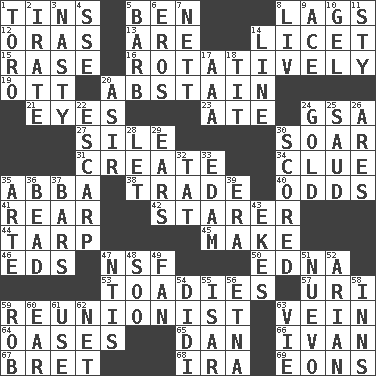 ACROSS 1. Metal containers 5. Benjamin's nick name 8. Fails to keep up a pace 12. Mouths or openings 13. "We ___ not amused" (Victoria) 14. It is permitted: Lat. 15. To erase 16. Happening in regular succession 19. Baseball player Mel 20. Refrain by choice 21. Snake ____ (dice throw) 23. Had dinner 24. Girls' org. (abbr.) 27. Drop; flow; fall 30. Fly high 31. Make 34. A slight indication 35. Swedish rock group 38. Buy and sell 40. Probability 41. Buttocks 42. A viewer who gazes fixedly 44. Canvas cover 45. Cause to be 46. Begley and Asner 47. Overdraft (abbr.) 50. Pulitzer Prize-winning author Ferber 53. Sycophants 57. RI univ. 59. One who advocates reunion 63. Distinctive style or manner 64. Fertile tracts in a desert 65. One of the 12 tribes of Israel 66. "Terrible" tsar 67. Cy Young winner Saberhagen 68. Lyricist Gershwin 69. Immeasurably long periods of time DOWN 1. "Corrida" creature 2. Feeling or showing extreme anger 3. Smutty 4. Compass dir. 5. Sharp remark 6. Greek god of love 7. Remaining after all deductions 8. 54 in ancient Rome 9. Adept person 10. Set 11. Filthy place 14. Actor's bit 17. Auto club (abbr.) 18. Teat (slang) 20. SW Saudi Arabia district 22. Fortification 24. Aureate 25. Saudi Arabian king (1953-1964) 26. Ancient Greek god of war 28. Allow 29. Hearing organs 30. Tallied 32. Make lace 33. Dutch treat 35. Johnson of "Laugh-In" 36. Necklace unit 37. Taverns 39. Period 43. Supplements with great effort 47. Nuclear Threat Initiatives 48. "Barney Miller" actor Jack 49. Avid follower 51. New (sp.) 52. Believer in; advocate of (suffix) 54. "You Light Up My Life" star Conn 55. Austrian river, tributary to the Danube 56. Inactive volcano in Sicily 58. Restaurants 59. Director Reiner 60. Hearing organ 61. Purpose 62. Fish or hair follower 63. Compete