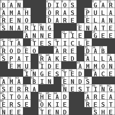 ACROSS 1. Bar 4. "Vaya con ____" 8. Slender fish 11. Wet nurse 13. Mouths or openings 14. Monetary unit of Botswana 15. Western Nevada city 16. Have the gumption 17. Enthusiasm 18. Catching in a trap 21. Related on the mother's side 22. Queen of England 1702-14 23. Neckwear 25. Turn to the right 26. Call ___ day 29. A testis 32. Cowboy competition 34. "We ___ not amused" (Victoria) 35. Pat or tap gently 38. Petty quarrel 39. Moved through 41. Silent film actress Nazimova 43. Australian flightless bird 44. Binary compound 45. ID or VA city 46. Eaten 50. Adept person 51. Nanny (var.) 54. Storage container 55. Extremities 57. Father Junipero _ 59. Inhabiting a nest 63. Portico 64. Froth on beer 67. Length times width 68. Celtic language 69. Migrant worker of the '30s 70. Relief 71. Born 72. Look after 73. A female animal or person DOWN 1. Taverns 2. So be it 3. Grandmother 4. Evades 5. Retirement account (abbr.) 6. Boat paddle 7. Compass dir. 8. POW camp 9. Having winglike extensions 10. The wife of a rajah (variant) 12. Israeli folk dance 14. Animal enclosure 19. To the inside or interior of 20. Compass dir. 21. Snakelike fish 23. Hoop that covers a wheel 24. On the rocks 26. Big collection agency 27. Drink excessively 28. First man 30. Receives possession of 31. Dutch treat 33. Needle holder 36. _ mater 37. Alliance 39. Swiss mountan, "Queen of the Mountains" 40. An important port of Yemen 42. A saturated hydrocarbon 45. Does sums 47. Basketball assoc. 48. Watched over 49. Compass dir. 51. NE Netherlands city 52. Distance measurement (Brit.) 53. Came up 56. Play the lead 58. Actress Charlotte 60. Angers 61. Delicate 62. Yard entry 64. Being at a high temperature 65. Make supply last 66. The 18th letter of the Arabic alphabet