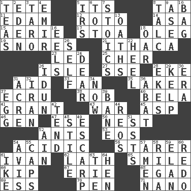 ACROSS 1. Wig 5. ___ a Wonderful Life 8. Bar bill 11. Dutch treat 12. Printing process, for short 14. White ___ sheet 15. Nest on high 17. Portico 18. Cassini of fashion 19. Sounds asleep 21. New York city 23. Directed 25. "Mermaids" star 26. Small island 27. Compass dir. 28. Supplement with great effort 31. Assist 33. Air blower 35. Member of a famous L.A. basketball team 37. Shade of tan 38. Director Reiner 40. Actor Lugosi 41. Let have 43. Armed conflict 45. Cleo's killer 46. Commissioned mil. rank 47. Compass dir. 50. Egg locale 52. Pismires 53. Greek goddess of the dawn 54. Being or containing an acid 56. A viewer who gazes fixedly 61. "Terrible" tsar 62. Thin strip of wood or metal 65. Grin 66. Sleep 67. One of the Great Lakes 68. Mild oath 69. Curvy letter 70. Animal enclosure 71. Billionth: prefix DOWN 1. Beverages made from leaves 2. Genesis locale 3. Pacific island yam 4. Independent ruler or chieftain 5. Big collection agency 6. Small child 7. Unemotional ones 8. Baby powder 9. Toward the sea 10. Paper or plastic container 13. Profane or obscene expressions 16. Snakelike fish 18. Rowing implement 20. Itself 22. Person who is morally reprehensible 24. Letter starter 26. Goddess of spring and wife of Bragi 28. Supplements with great effort 29. Seaweed 30. Period 31. 1/640 square mile 32. SW Asia republic 34. Immediately 36. Blind as ____ 37. Ovum 39. Object of repulsion 42. Look after 44. Vintage cars 48. Vertical member of a panel or frame 49. Fortification 51. Fast planes 52. The 18th letter of the Arabic alphabet 54. Deliberation 55. Balmoral and tarboosh 57. So be it 58. Port city in Latvia 59. Liveliness 60. Make new 61. D.D.E's nickname 63. Neckwear 64. Layer