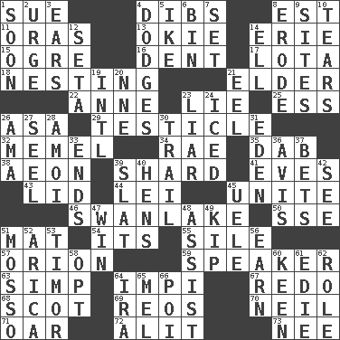 ACROSS 1. Institute legal proceedings 4. Rights 8. Eastern Standard Time (abbr.) 11. Mouths or openings 13. Migrant worker of the '30s 14. One of the Great Lakes 15. Legendary monster 16. Scratch 17. Globular water bottle used in Asia 18. Inhabiting a nest 21. A person who is older than you are 22. Singer Murray 23. Whopper 25. Curvy letter 26. White ___ sheet 29. A testis 32. Klaipeda city 34. Actress Charlotte 35. Small moist lump or mass 38. Age 39. Broken piece 41. Nights before holidays 43. Flaplike covering 44. Luau accessory 45. Join together 46. Tchaikovsky ballet 50. Compass dir. 51. Floor protector 54. It is 55. Filth; sediment 57. Greek mythologigal hunter 59. Orator 63. Simple or foolish person 64. Body of Kaffir warriors 67. Make new 68. Highlander 69. Vintage cars 70. Famous astronaut Armstrong 71. Boat paddle 72. Came down and settled, as after flight 73. Born DOWN 1. Within a short period 2. Goad 3. Hearing organs 4. Evades 5. D.D.E's nickname 6. Storage container 7. Put into a specified state 8. Wear away 9. Settings 10. Rends 12. Bristle 14. Pipe bend 19. International (abbr.) 20. Compass dir. 21. Snakelike fish 23. One who doesn't tell the truth 24. On the rocks 26. Housemaid (var.) 27. Stitch closed the eyes of (a falcon) 28. Mine, in Marseilles 30. Lag or linger behind 31. Genesis locale 33. Conclusions 36. Opinion 37. Wagers 39. Narrow board 40. Coop moms 42. Perceive with the eye 45. Ubangi River tributary 47. Victory 48. Aid 49. Sleep 51. With motion or animation 52. N. Chile seaport 53. Southeast Indonesia island 56. Merit 58. Elect 60. Peachy ____! 61. Singer Brickell 62. Hero or heavy, e.g. 64. Retirement account (abbr.) 65. Cartoonist voice _ Blanc 66. Luau course