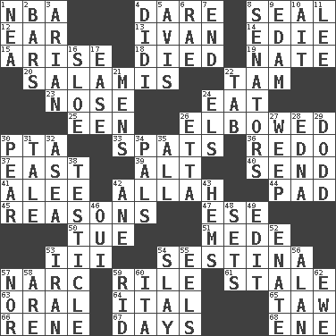ACROSS 1. Basketball assoc. 4. Have the gumption 8. Lick closed 12. Ewer handle 13. "Terrible" tsar 14. Singer Brickell 15. Originate 18. Passed on 19. Nathan's nickname 20. Deli grouping 22. Scottish cap 23. Olfactory organ 24. Consume 25. Car or cant ending 26. Turned at an angle; bent 30. Parent Teacher Association (abbr.) 33. Arguments over trivial matters 36. Redecorate 37. 90 degrees 39. Keyboard modifier key 40. Post 41. Toward shelter 42. Assad's deity 44. Writing tablet 45. Thinks logically 47. Compass dir. 50. Third day of the wk. 51. Ancient Persian 53. One more than two 54. French poetic form 57. Drug cop 59. Cause heat under the collar 61. Having lost freshness 63. Spoken 64. Slanted text style (abbr.) 65. The 23rd letter of the Hebrew alphabet 66. French philosopher Descartes 67. 24-hour periods 68. Compass dir. DOWN 1. Teachers' org. 2. Soap units 3. Believer in; advocate of (suffix) 4. "You Light Up My Life" star Conn 5. Opinion 6. Actress Charlotte 7. Conclusion 8. Legislators 9. Dutch treat 10. Small island 11. Area sheltered from the wind 16. A type of plum 17. Relaxation 21. Not women's 22. Keyboard key 24. Raised railways 26. Singer James 27. Shed a tear 28. Pulitzer Prize-winning author Ferber 29. Texas town _ City 30. Lightbulb-shaped fruit 31. Lie 32. At sea 34. Friends 35. 100% 38. A testis 42. One (Scot) 43. Is hesitant and indecisive 46. Fr. "Yes" 48. Arranges properly for use 49. Prepare for publication 52. Maternal 53. SW Asia republic 54. Kill 55. Snakelike fish 56. ____ Jay Lerner 57. Or not 58. "We ___ not amused" (Victoria) 59. To free from 60. Call ___ day 62. She-sheep