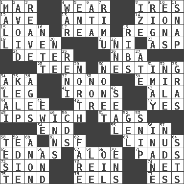 ACROSS 1. Impair 4. Put on (as clothing) 8. Angers 12. "___ Maria" 13. Opposed to 14. The Jewish people; Israel 15. Grant temporary use of 17. 480, 500 or 516 sheets of paper 18. Rain (Swedish) 19. Make or become more lively 21. University (slang) 23. Viper 24. Prevent from occurring 26. Basketball assoc. 28. Adolescent 30. Inhabiting a nest 34. Alias (abbr.) 37. Words to Nanette 39. Independent ruler or chieftain 40. Part of a journey 41. Removes the wrinkles 43. Insect wing 44. Toward shelter 46. Family _ (genealogy) 47. Consenting reply 48. NE Massachusetts town 51. Labels 54. Conclude 55. Soviet premier 1918-24 58. Afternoon social gathering 61. Science/research agcy. 63. "_ and Lucy" (Charlie Brown theme song) 65. Ferber et al. 67. _ vera 71. Writing tablets 72. The Jewish people; Israel 73. It's straight from the horse's mouth 74. Fish or hair follower 75. Watch over 76. Snakelike fish 77. Double-curved letter DOWN 1. Shopping center 2. Prevent from happening 3. Break or tear apart 4. Armed conflict 5. Compass dir. 6. "One Day ___ Time" 7. Tall New Zealand timber tree 8. Ending with capital 9. Capital of Latvia 10. Immeasurably long periods of time 11. Fastener 16. Remaining after all deductions 18. Chest bones 20. Born 22. Compass dir. 25. Painter Guido (1575-1642) 27. Had dinner 29. _ pole 30. Music written for nine 31. "If ____ say so..." 32. The longest river in the world 33. Pate de foie ____ 34. Jai _ 35. Seaweed 36. Ripens 38. Or not 42. Lick closed 45. She-sheep 49. Lodging establishments 50. Music discs 52. Set 53. Sever or remove by pinching or nipping 56. Empty; void 57. Unadorned figures 58. Trial 59. Singer Brickell 60. At once, immediately (arch.) 62. Conductor's collection 64. Fast planes 66. Added to 68. Area sheltered from the wind 69. Petroleum 70. Followers of ems