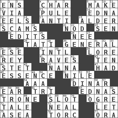 ACROSS 1. Followers of ems 4. Burn to charcoal 8. Cause to be 12. By way of 13. Whine 14. Pulitzer Prize-winning author Ferber 15. Snakelike fish 17. Against 18. Tree or shrub in the Birch family 19. Fraudulent business schemes 21. Dreamland 23. Elected rep. 24. Proofreads 26. Born 28. Jacques of French films 30. Commissioned military rank 34. Compass dir. 37. International (abbr.) 39. Old wives' tales, e.g. 40. Marina Del _, California 41. All-night dance parties 43. Nine, plus one 44. Proofreading order 46. Nanny 47. Possessed 48. Substance 51. The longest river in the world 54. American Automobile Association (abbr.) 55. Middle Eastern gold or silver currency 58. Hearing organ 61. Three (prefix) 63. Ferber et al. 65. Heavy duty weighing machine 67. Position in a hierarchy or organization 71. Legendary monster 72. Story 73. Anneal 74. Allow 75. At sea 76. Torque (variant) 77. Mouth or opening DOWN 1. Nights before holidays 2. Sibling's daughter 3. First course 4. Numbers guy (abbr.) 5. Attila the _ 6. Keyboard modifier key 7. It's straight from the horse's mouth 8. Cartoonist voice _ Blanc 9. Sums up 10. Leg joint 11. Merit 16. Stricken, poetically 18. An important port of Yemen 20. R.R. building 22. Single 25. Move through with a circular motion 27. Snakelike fish 29. Lacking in sense or substance 30. American astronaut and politician John 31. Writer of Portnoy's Complaint (1969) 32. Type of rug 33. Grant temporary use of 34. Celtic language 35. Arranges properly for use 36. Sight organs 38. Federal power corp. 42. Expressed in words 45. Afternoon social gathering 49. Nathan's nickname 50. Auto 52. Untruth 53. Inside; within (prefix) 56. White American of non-Hispanic descent 57. More uncommon 58. Singer James 59. Caspian sea tributary 60. Hero or heavy, e.g. 62. Is not 64. Stalk of a moss capsule 66. Teachers' org. 68. Lion 69. Boat paddle 70. Affectionate concern, for short