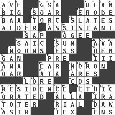 ACROSS 1. "___ Maria" 4. Girls' org. (abbr.) 7. ____ Bator, Mongolia 11. Of large size 12. Fly high 13. Eat (away) 14. Sound made by sheep 15. Torque (variant) 16. Chalkboards 17. Tree or shrub in the Birch family 19. Aide 21. Plant excrement 23. Double curve, resembling the letter S 24. Ketch in the Levant 25. Player for Phoenix 26. Actress Gardner 29. Parts of speech 30. Curvy letter 31. Lair 32. Separate the seeds from cotton 33. Before (prefix) 34. One more than two 35. Santa ___, CA 36. Hearing organ 37. Person of subnormal intelligence 40. Rowing implement 41. _ moment's notice (2 wds.) 42. Ancient Greek god of war 43. Old wives' tales, e.g. 45. Music discs 46. Home 51. Principle of right and wrong 55. Declaimed 56. Silent film actress Nazimova 58. Retirement account (abbr.) 59. Carrier 60. Monetary unit of Yemen 61. Obsolete 62. SW Saudi Arabia district 63. John Ritter's dad 64. Followers of ems DOWN 1. Swedish rock group 2. Small bottle 3. Mild oath 4. Thick or sticky substance 5. "Two Mules for Sister ____" 6. Curves 7. A salt of uric acid 8. Globular water bottle used in Asia 9. An important port of Yemen 10. Egg locale 12. Put through a sieve 13. Otherwise 16. Omens 18. Son of Isaac 20. Boozer 22. Personal Computers (abbr.) 24. Underwater navigation system 25. Spanish missionary in California 26. Goodbye (Sp.) 27. Distinctive style or manner 28. Black tropical American cuckoo 29. Grandmother 32. E Mali city 33. Eucharist need 36. Having ears or earlike features 37. Big _ 38. Severe or trying experience 39. Repose 43. 61 cubic inches 44. River in Europe 46. Round or rotation of duties 47. Greek god of love 48. Suttee (variant) 49. Haul 50. Writer Wiesel 52. Flintstone garb 53. SW Asia republic 54. Crow sounds 57. Not strict