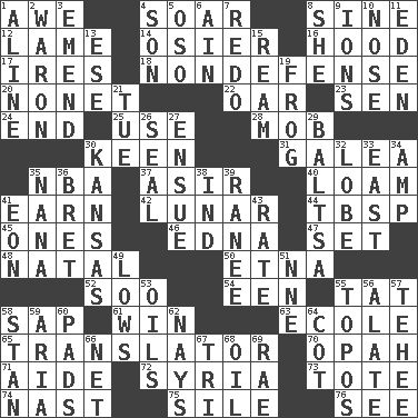 ACROSS 1. Deep reverence 4. Fly high 8. Trig term 12. Unable to walk 14. Flexible twig of a willow tree 16. Parka part 17. Angers 18. Unrelated to defense, as in spending 20. Music written for nine 22. Boat paddle 23. Elected rep. 24. Conclusion 25. Purpose 28. Disorderly crowd 30. Peachy ____! 31. An organ shaped like a helmet 35. Basketball assoc. 37. SW Saudi Arabia district 40. Rich soil 41. Merit 42. Type of eclipse 44. Cook's measure (abbr.) 45. Washington bills 46. Pulitzer Prize-winning author Ferber 47. Arrange properly for use 48. Relating to or accompanying birth 50. Inactive volcano in Sicily 52. "Barney Miller" actor Jack 54. Car or cant ending 55. Make lace 58. Plant excrement 61. Acquire through effort 63. Learning spot: Fr. 65. Interpreter 70. Brightly colored fish 71. Helper 72. Damascus' land 73. Lug 74. Political cartoonist Thomas 75. Drop; flow; fall 76. Perceive with the eye DOWN 1. Place in a line 2. Make _____ (do battle with) 3. Make improvements or corrections to 4. Male offspring 5. Bear (Spanish) 6. The 18th letter of the Arabic alphabet 7. Make new 8. A female animal or person 9. Charged atoms 10. Sense of smell 11. Paradise 13. Compass dir. 15. 480, 500 or 516 sheets of paper 19. Toadlike animal 21. Third day of the wk. 26. Lick closed 27. Take place subsequently 29. Greek mezzo-soprano Agnes 30. Sunflower state 32. Ear part 33. 90 degrees 34. Electrical Unit 35. Nanny 36. Cy Young winner Saberhagen 38. Working for oneself (abbr.) 39. The wife of a rajah (variant) 41. Period of immesurable duration 43. Assign a rank or rating to 49. Coldest temperatures 51. Compass dir. 53. Petroleums 55. Literary convention 56. Having winglike extensions 57. Giggle 58. Comedian Laurel of Laurel & Hardy 59. Roberta Peters solo 60. Groovy apts. 62. Negative votes 64. Small bed 66. Fish or hair follower 67. Three (prefix) 68. Petroleum 69. Actress Charlotte