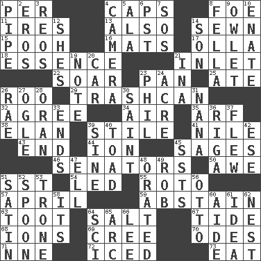 ACROSS 1. For each 4. Smile enhancers 8. Enemy 11. Angers 13. In addition 14. Stitched 15. "Silly old bear" 16. Floor protectors 17. Rounded earthenware pot or jar 18. Substance 21. An arm off of a larger body of water 22. Fly high 23. Baking dish 25. Had dinner 26. Friend of Pooh 29. File 13 32. Match 34. Wind 35. Sandy's bark 38. Enthusiasm 39. Vertical member of a panel or frame 41. The longest river in the world 43. Conclude 44. Electrically charged atom 45. Gurus 46. Legislators 50. Deep reverence 51. Fast jet (abbr.) 54. Directed 55. Printing process, for short 57. Showery time 59. Refrain by choice 63. A blast of a horn 64. Table seasoning 67. Event that recurs at intervals 68. Charged particles 69. Algonquian 70. Lyric poems 71. Compass dir. 72. On the rocks 73. Erode DOWN 1. Corncob 2. Greek god of love 3. Vintage cars 4. Device for capturing images 5. Insect wing 6. Pacific Standard Time (abbr.) 7. Distress signal 8. Chap (slang) 9. A small or young owl 10. Maternal 12. "______ My Girl" (Turtles hit) 14. Manchild 19. Make mention of 20. 4-wheeled motor vehicle 21. _ tizzy (2 wds.) 23. Silvers or Donahue 24. 43,560 square feet 26. Actress Charlotte 27. Stare 28. NW Algerian seaport 30. Virtuous person 31. Nanny 33. Conclusions 36. Port city in Latvia 37. Soared 39. Trig term 40. Frog relative 42. Compass dir. 45. Fast planes 47. Pipe bend 48. Spoke pompously 49. Director Reiner 51. Smooth fabric 52. Soup utensil 53. Heavy duty weighing machine 56. "Beetle Bailey" pooch 58. ___ a Wonderful Life 60. Helper 61. The content of cognition 62. A home for chicks 64. _-fi 65. Curve 66. Area sheltered from the wind