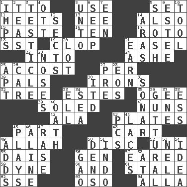 ACROSS 1. "Tell ____ the Marines!" 5. Purpose 8. Put into a specified state 11. Confronts 13. Born 14. In addition 15. Thick mixture 16. Nine, plus one 17. Printing process, for short 18. Fast jet (abbr.) 19. Hoof sound 21. Artist's stand 22. To the inside or interior of 24. American tennis player Robert 25. Buttonhole 27. For each 29. Friends 30. Metal shackles 32. Woody plant 33. _____ Park, CO 35. Double curve, resembling the letter S 39. Having a sole or soles 41. Religious women 42. Insect wing 43. Food holders 45. Role in a play 48. Haul 49. Assad's deity 50. Flat circle 52. University (slang) 55. Raised platform 56. Commissioned military rank (abbr.) 57. Having ears or earlike features 59. Unit of force 60. Also 61. Lacking originality or spontaneity 62. Compass dir. 63. Bear (Spanish) 64. Silent film actress Nazimova DOWN 1. Naughty children 2. Beverages made from leaves 3. One of the two male reproductive glands 4. Baseball player Mel 5. To (old English) 6. Ooze 7. Car or cant ending 8. Agitate, as a liquid 9. First name in cosmetics 10. Instrument 12. Religious groups 14. Caspian sea tributary 20. Car dealer's back yard 21. Merit 23. Olfactory organs 25. Fitting 26. 4-wheeled motor vehicle 27. Before (prefix) 28. Greek goddess of the dawn 30. It would 31. Underwater navigation system 33. Pipe bend 34. Ocean 36. From the throat 37. Compass dir. 38. Double-curved letter 40. Pledge 43. Personal Computers (abbr.) 44. Shoestrings 45. Frolics 46. Place in a line 47. Raze (variant) 49. Sums up 50. Habitations of wild animals 51. _ china 53. 1994 drama film starring Jodie Foster 54. The content of cognition 56. E Mali city 58. _ moment's notice (2 wds.)